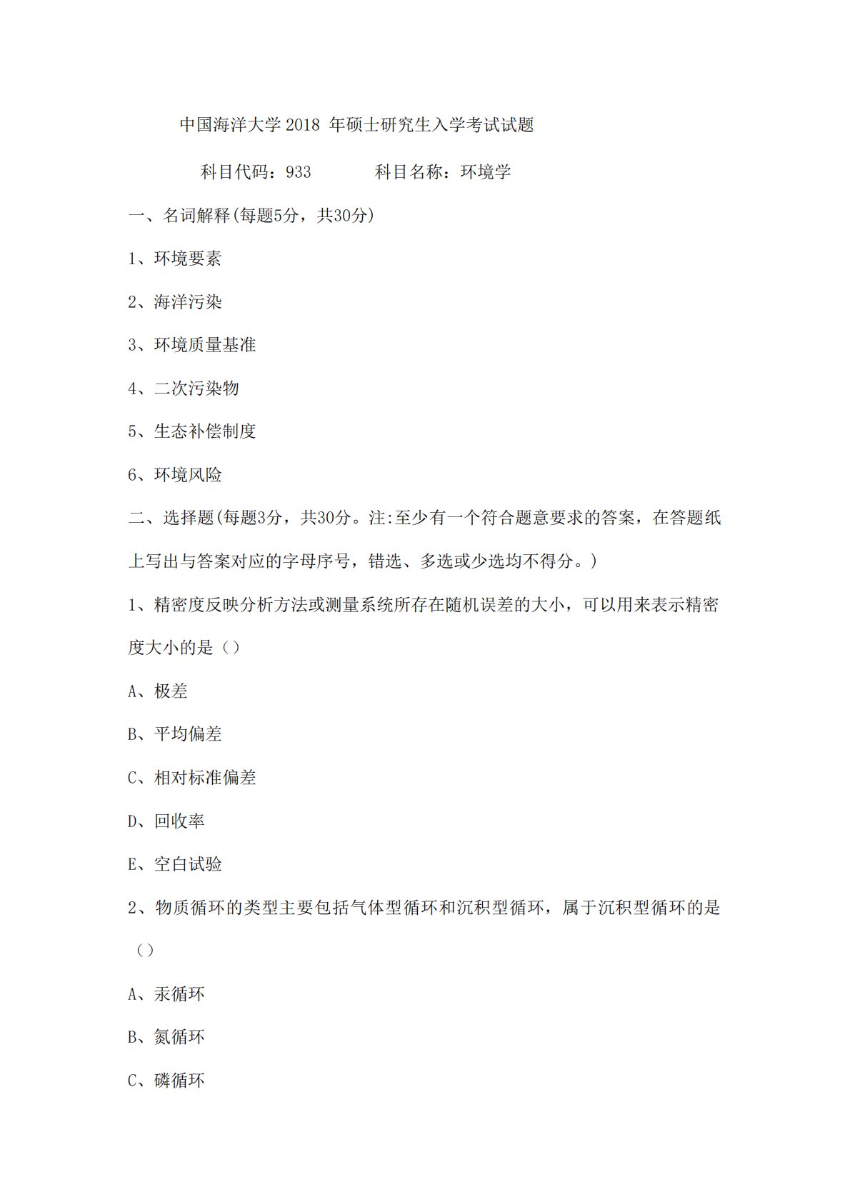 中国海洋大学2018年硕士研究生入学考试试题科目代码:933科目名称:环境学一、名词解释(每题5分,共30分)1、环境要素2、海洋污染3、环境质量基准4、二次污染物5、生态补偿制度6、环境风险二、选择题(每题3分,共30分。注:至少有一个符合题意要求的答案,在答题纸上写出与答案对应的字母序号,错选、多选或少选均不得分。)1、精密度反映分析方法或测量系统所存在随机误差的大小,可以用来表示精密度大小的是()A、极差B、平均偏差C、相对标准偏差D、回收率E、空白试验2、物质循环的类型主要包括气体型循环和沉积型循环,属于沉积型循环的是()A、汞循环B、氮循环C、磷循环D、钙循环E、硫循环3、下述正确的...