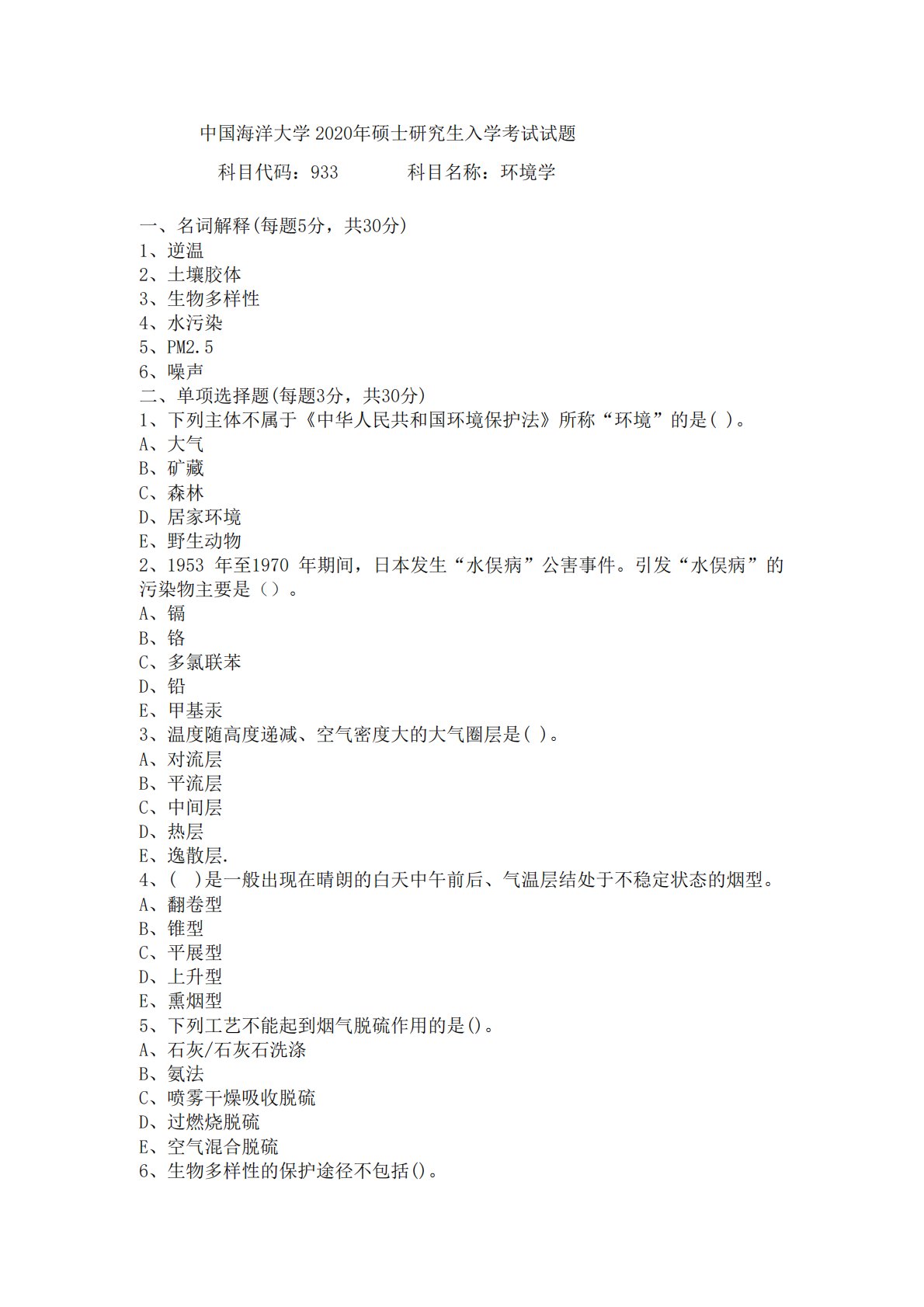 中国海洋大学2020年硕士研究生入学考试试题科目代码:933科目名称:环境学一、名词解释(每题5分,共30分)1、逆温2、土壤胶体3、生物多样性4、水污染5、PM2.56、噪声二、单项选择题(每题3分,共30分)1、下列主体不属于《中华人民共和国环境保护法》所称“环境”的是()。A、大气B、矿藏C、森林D、居家环境E、野生动物2、1953年至1970年期间,日本发生“水俣病”公害事件。引发“水俣病”的污染物主要是()。A、镉B、铬C、多氯联苯D、铅E、甲基汞3、温度随高度递减、空气密度大的大气圈层是()。A、对流层B、平流层C、中间层D、热层E、逸散层.4、()是一般出现在晴朗的白天中午前后、...