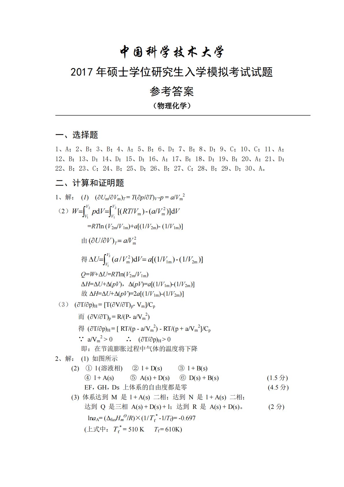 中国科学技术大学2017年硕士学位研究生入学模拟考试试题参考答案(物理化学)一、选择题1、A;2、B;3、B;4、A;5、B;6、D;7、B;8、D;9、C;10、C;11、A;12、B;13、D;14、D;15、D;16、A;17、B;18、D;19、B;20、A;21、D;22、B;23、C;24、B;25、D;26、B;27、C;28、B;29、D;30、A。二、计算和证明题1、解:(1)(Um/Vm)T=T(p/T)V-p=a/Vm2(2)WpVRTVaVVVVVVd[(/)-(/)]dmm21122=RTln(V2m/V1m)+a[(1/V2m)-(1/V1m)]由...