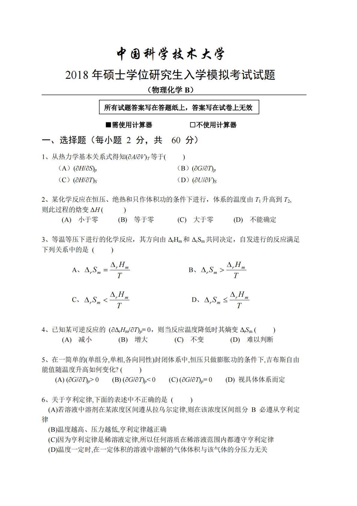 中国科学技术大学2018年硕士学位研究生入学模拟考试试题(物理化学B)■需使用计算器□不使用计算器一、选择题(每小题2分,共60分)1、从热力学基本关系式得知(A/V)T等于()(A)(H/S)p(B)(G/T)p(C)(H/T)S(D)(U/V)S2、某化学反应在恒压、绝热和只作体积功的条件下进行,体系的温度由T1升高到T2,则此过程的焓变ΔH()(A)小于零(B)等于零(C)大于零(D)不能确定3、等温等压下进行的化学反应,其方向由ΔrHm和ΔrSm共同决定,自发进行的反应满足下列关系中的是()A、rmrmSHTB、rmrmSHTC、rmrmSHTD、...
