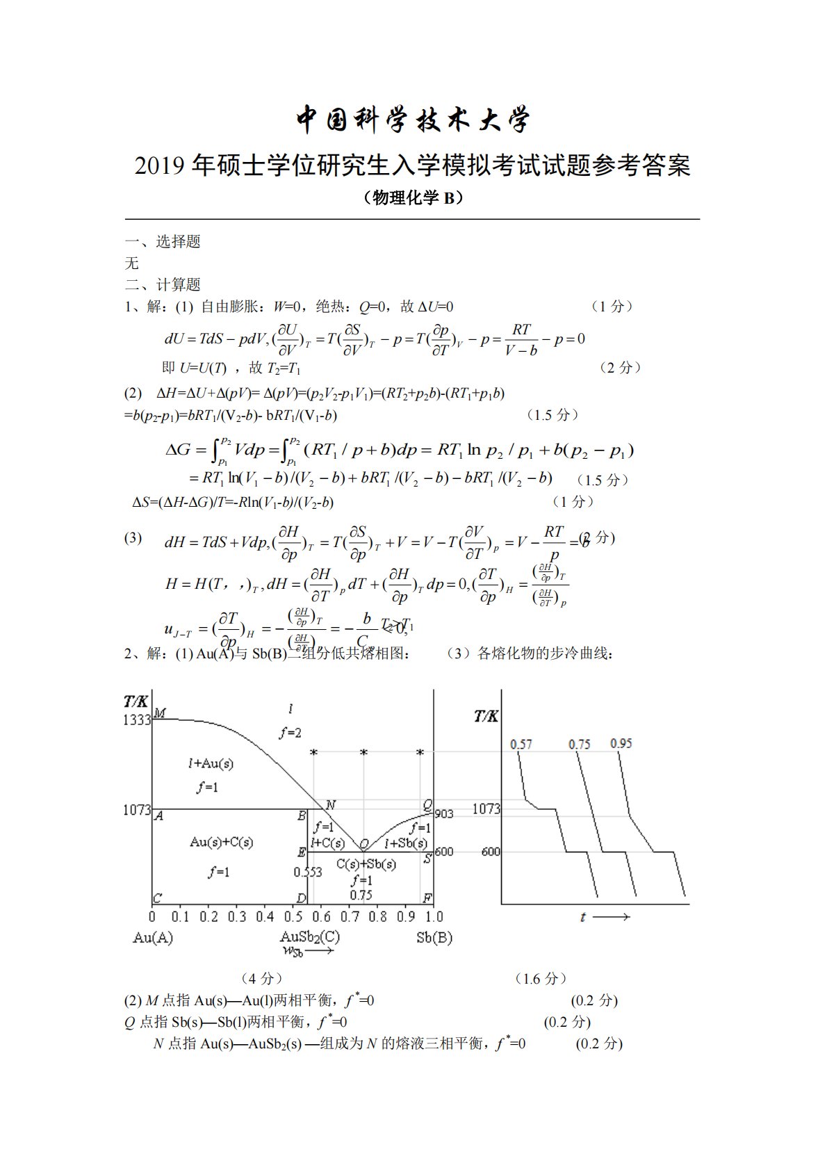 中国科学技术大学2019年硕士学位研究生入学模拟考试试题参考答案(物理化学B)一、选择题无二、计算题1、解:(1)自由膨胀:W=0,绝热:Q=0,故ΔU=0(1分)即U=U(T),故T2=T1(2分)(2)ΔH=ΔU+Δ(pV)=Δ(pV)=(p2V2-p1V1)=(RT2+p2b)-(RT1+p1b)=b(p2-p1)=bRT1/(V2-b)-bRT1/(V1-b)(1.5分)(1.5分)ΔS=(ΔH-ΔG)/T=-Rln(V1-b)/(V2-b)(1分)