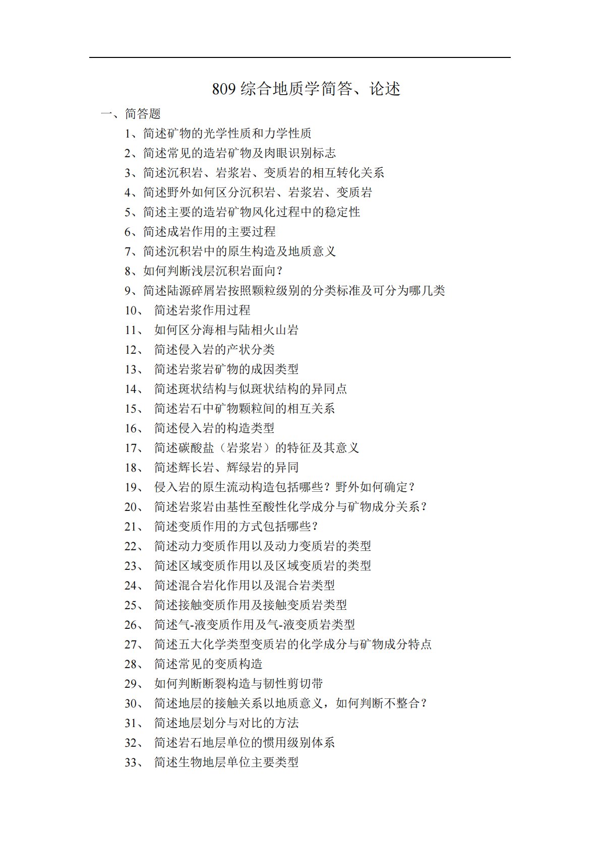 809综合地质学简答、论述一、简答题1、简述矿物的光学性质和力学性质2、简述常见的造岩矿物及肉眼识别标志3、简述沉积岩、岩浆岩、变质岩的相互转化关系4、简述野外如何区分沉积岩、岩浆岩、变质岩5、简述主要的造岩矿物风化过程中的稳定性6、简述成岩作用的主要过程7、简述沉积岩中的原生构造及地质意义8、如何判断浅层沉积岩面向?9、简述陆源碎屑岩按照颗粒级别的分类标准及可分为哪几类10、简述岩浆作用过程11、如何区分海相与陆相火山岩12、简述侵入岩的产状分类13、简述岩浆岩矿物的成因类型14、简述斑状结构与似斑状结构的异同点15、简述岩石中矿物颗粒间的相互关系16、简述侵入岩的构造类型17、简述碳酸盐(...