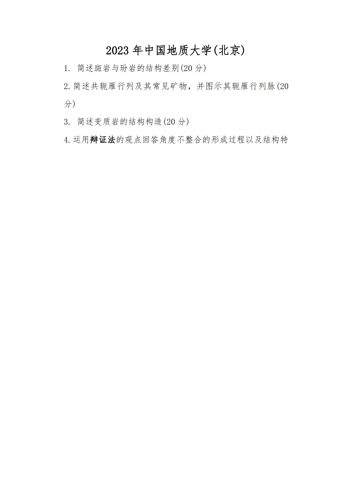 2023年中国地质大学(北京)1.简述斑岩与玢岩的结构差别(20分)2.简述共轭雁行列及其常见矿物,并图示其轭雁行列脉(20分)3.简述变质岩的结构构造(20分)4.运用辩证法的观点回答角度不整合的形成过程以及结构特2023年中国地质大学(北京)1.简述斑岩与玢岩的结构差别(20分)2.简述共轭雁行列及其常见矿物,并图示其轭雁行列脉(20分)3.简述变质岩的结构构造(20分)4.运用辩证法的观点回答角度不整合的形成过程以及结构特征(30分)5.论述基性岩的浅成侵入岩,深成侵入岩,喷出岩的结构构造差异(30分)。6.论述构造层次的类型,以及图示各层次构造的典型特征(30分).百校文库—海量高校资...