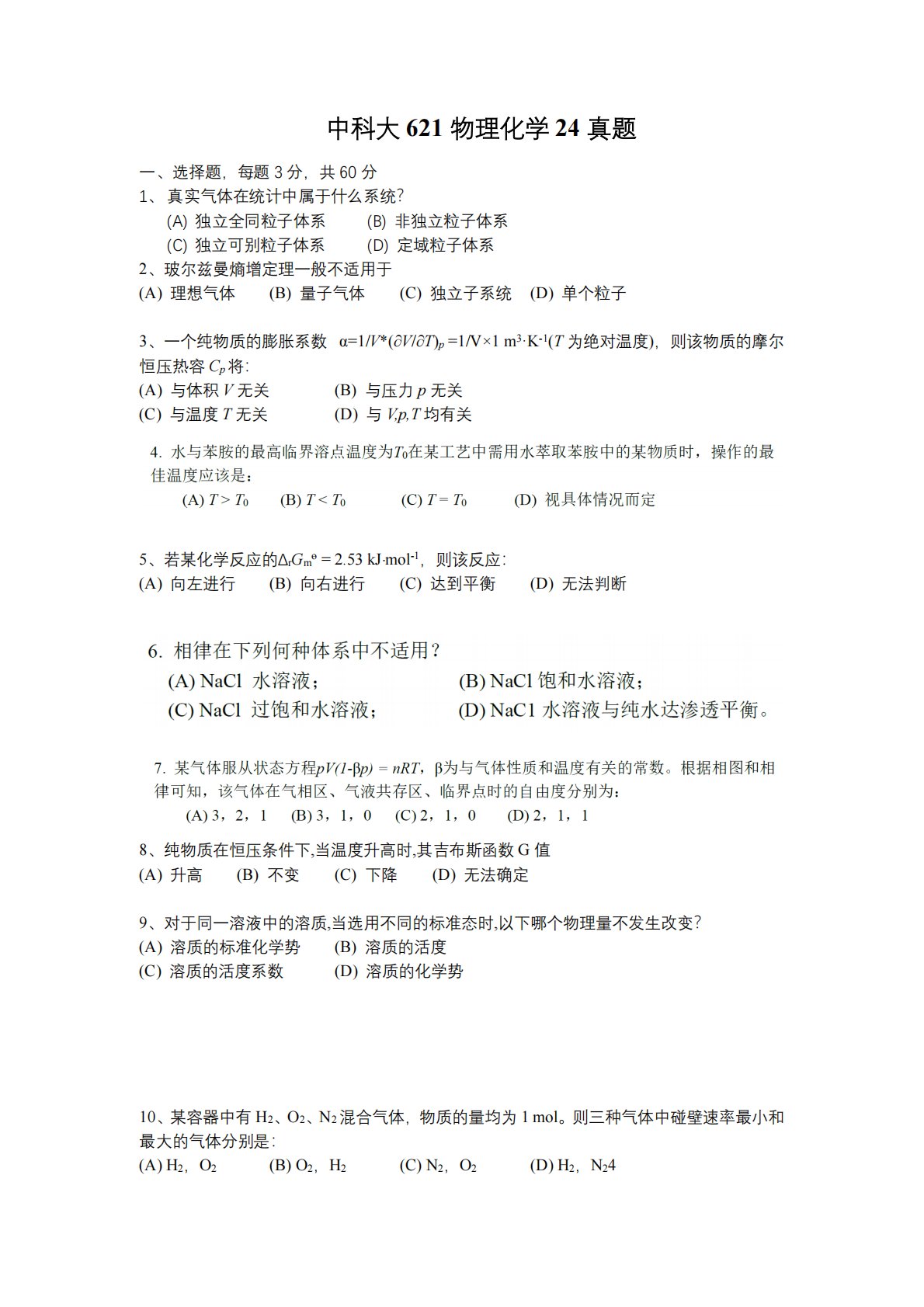 一、选择题,每题3分,共60分1、真实气体在统计中属于什么系统中科大621物理化学24真题?(A)独立全同粒子体系(B)非独立粒子体系(C)独立可别粒子体系(D)定域粒子体系2、玻尔兹曼熵增定理一般不适用于(A)理想气体(B)量子气体(C)独立子系统(D)单个粒子3、一个纯物质的膨胀系数α=1/V*(∂V/∂T)p=1/V×1m3·K-1(T为绝对温度),则该物质的摩尔恒压热容Cp将:(A)与体积V无关(B)与压力p无关(C)与温度T无关(D)与V,p,T均有关5、若某化学反应的ΔrGmө=2.53kJ·mol-1,则该反应:(A)向左进行(B)向右进行(C)达到平衡(D)无法判断8、纯物质在...