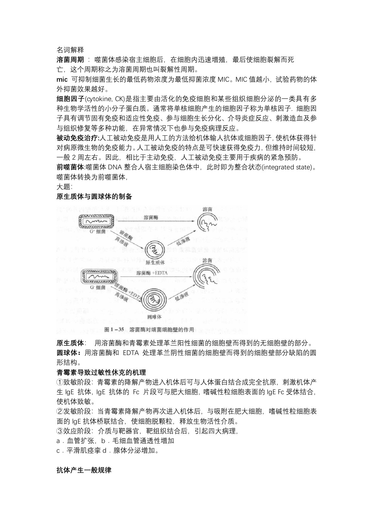 名词解释溶菌周期:噬菌体感染宿主细胞后,在细胞内迅速增殖,最后使细胞裂解而死亡,这个周期称之为溶菌周期也叫裂解性周期。mic可抑制细菌生长的最低药物浓度为最低抑菌浓度MIC。MIC值越小,试验药物的体外抑菌效果越好。细胞因子(cytokine,CK)是指主要由活化的免疫细胞和某些组织细胞分泌的一类具有多种生物学活性的小分子蛋白质。通常将单核细胞产生的细胞因子称为单核因子.细胞因子具有调节固有免疫和适应性免疫、参与细胞生长分化、介导炎症反应、刺激造血及参与组织修复等多种功能,在异常情况下也参与免疫病理反应。被动免疫治疗:人工被动免疫是用人工的方法给机体输人抗体或细胞因子,使机体获得针对病原微生物...