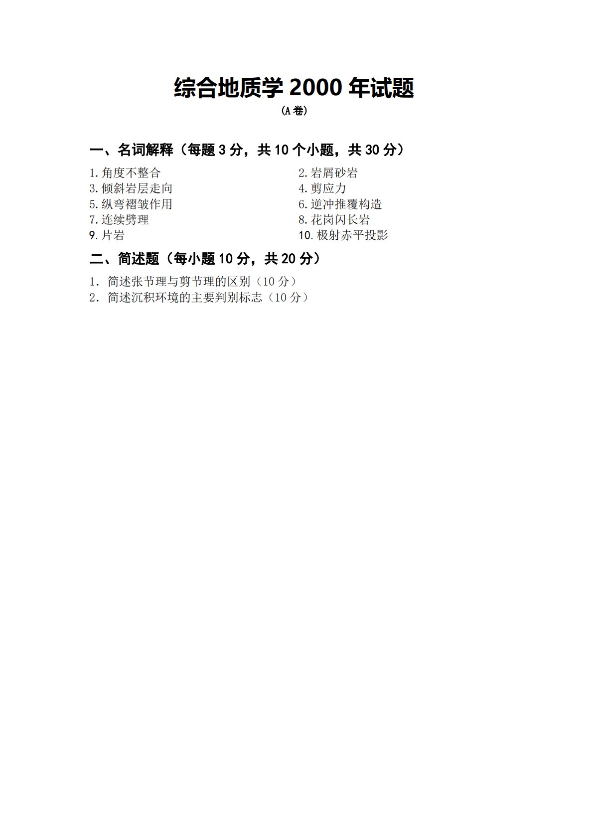 综合地质学2000年试题(A卷)一、名词解释(每题3分,共10个小题,共30分)1.角度不整合2.岩屑砂岩3.倾斜岩层走向4.剪应力5.纵弯褶皱作用6.逆冲推覆构造7.连续劈理8.花岗闪长岩9.片岩10.极射赤平投影二、简述题(每小题10分,共20分)1.简述张节理与剪节理的区别(10分)2.简述沉积环境的主要判别标志(10分)综合地质学2000年试题(A卷)一、名词解释(每题3分,共10个小题,共30分)1.角度不整合2.岩屑砂岩3.倾斜岩层走向4.剪应力5.纵弯褶皱作用6.逆冲推覆构造7.连续劈理8.花岗闪长岩9.片岩10.极射赤平投影二、简述题(每小题10分,共20分)1.简述张节理与剪...