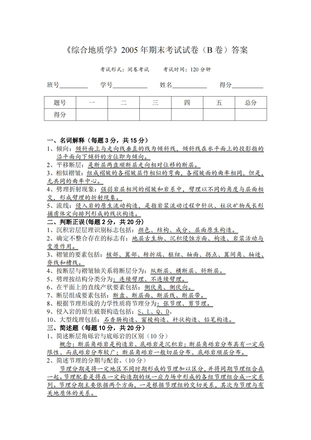 《综合地质学》2005年期末考试试卷(B卷)答案考试形式:闭卷考试考试时间:120分钟班号学号姓名得分题号一二三四五总分得分一、名词解释(每题3分,共15分)1、倾向:倾斜面上与走向线垂直的线为倾斜线,倾斜线在水平面上的投影指的沿平面向下倾斜的方位即为倾向。2、平移断层:是断层两盘顺断层走向相对位移的断层。3、相似褶皱:组成褶皱的各褶皱层作相似的弯曲,各褶皱面的曲率相同,但是,无共同的曲率中心。4、劈理折射现象:强弱岩层相间的褶皱和岩系中,劈理以不同的角度与层面相交,形成劈理的折射现象。5、流线:侵入岩的原生流动构造,是指岩浆流动过程中针状、柱状矿物或长形捕虏体定向排列形成的线状构造。二、判断...