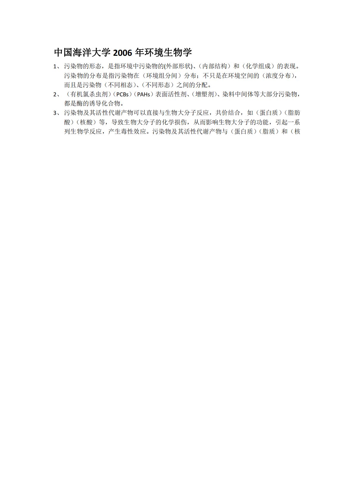 中国海洋大学2006年环境生物学1、污染物的形态,是指环境中污染物的(外部形状)、(内部结构)和(化学组成)的表现。污染物的分布是指污染物在(环境组分间)分布;不只是在环境空间的(浓度分布),而且是污染物(不同相态)、(不同形态)之间的分配。2、(有机氯杀虫剂)(PCBs)(PAHs)表面活性剂、(增塑剂)、染料中间体等大部分污染物,都是酶的诱导化合物。3、污染物及其活性代谢产物可以直接与生物大分子反应,共价结合,如(蛋白质)(脂肪酸)(核酸)等,导致生物大分子的化学损伤,从而影响生物大分子的功能,引起一系列生物学反应,产生毒性效应。污染物及其活性代谢产物与(蛋白质)(脂质)和(核中国海洋大学...