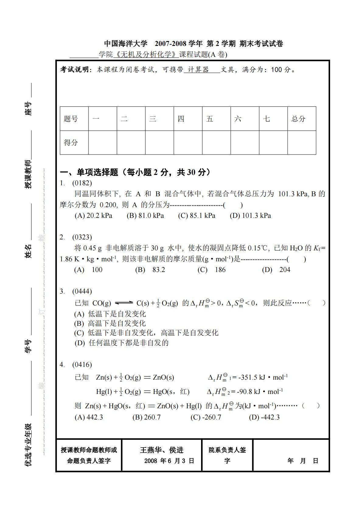 中国海洋大学2007-2008学年第2学期期末考试试卷学院《无机及分析化学》课程试题(A卷)考试说明:本课程为闭卷考试,可携带计算器文具,满分为:100分。一、单项选择题(每小题2分,共30分)1.(0182)同温同体积下,在A和B混合气体中,若混合气体总压力为101.3kPa,B的摩尔分数为0.200,则A的分压为----------------------()(A)20.2kPa(B)81.0kPa(C)85.1kPa(D)101.3kPa2.(0323)将0.45g非电解质溶于30g水中,使水的凝固点降低0.15℃,已知H2O的Kf=1.86K·kg·mol-1,则该非电解质的摩尔质量(...