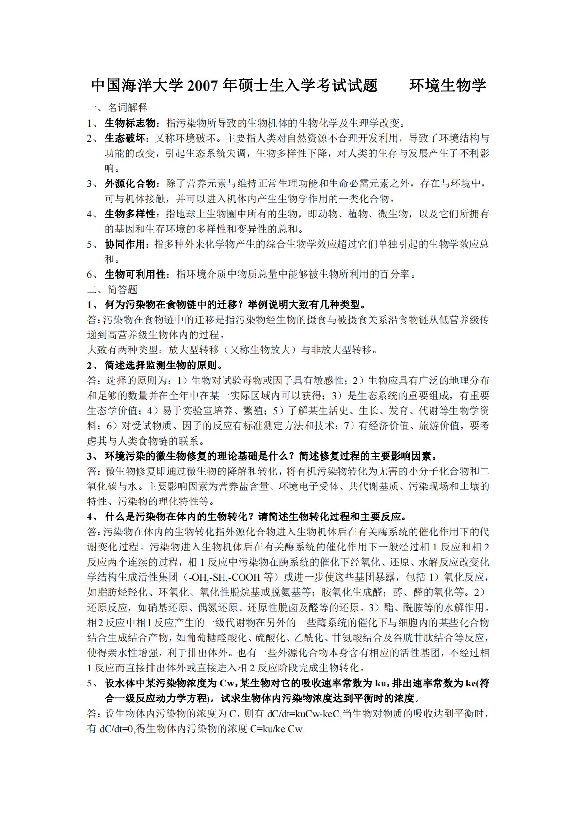 中国海洋大学2007年硕士生入学考试试题环境生物学一、名词解释1、生物标志物:指污染物所导致的生物机体的生物化学及生理学改变。2、生态破坏:又称环境破坏。主要指人类对自然资源不合理开发利用,导致了环境结构与功能的改变,引起生态系统失调,生物多样性下降,对人类的生存与发展产生了不利影响。3、外源化合物:除了营养元素与维持正常生理功能和生命必需元素之外,存在与环境中,可与机体接触,并可以进入机体内产生生物学作用的一类化合物。4、生物多样性:指地球上生物圈中所有的生物,即动物、植物、微生物,以及它们所拥有的基因和生存环境的多样性和变异性的总和。5、协同作用:指多种外来化学物产生的综合生物学效应超过它...