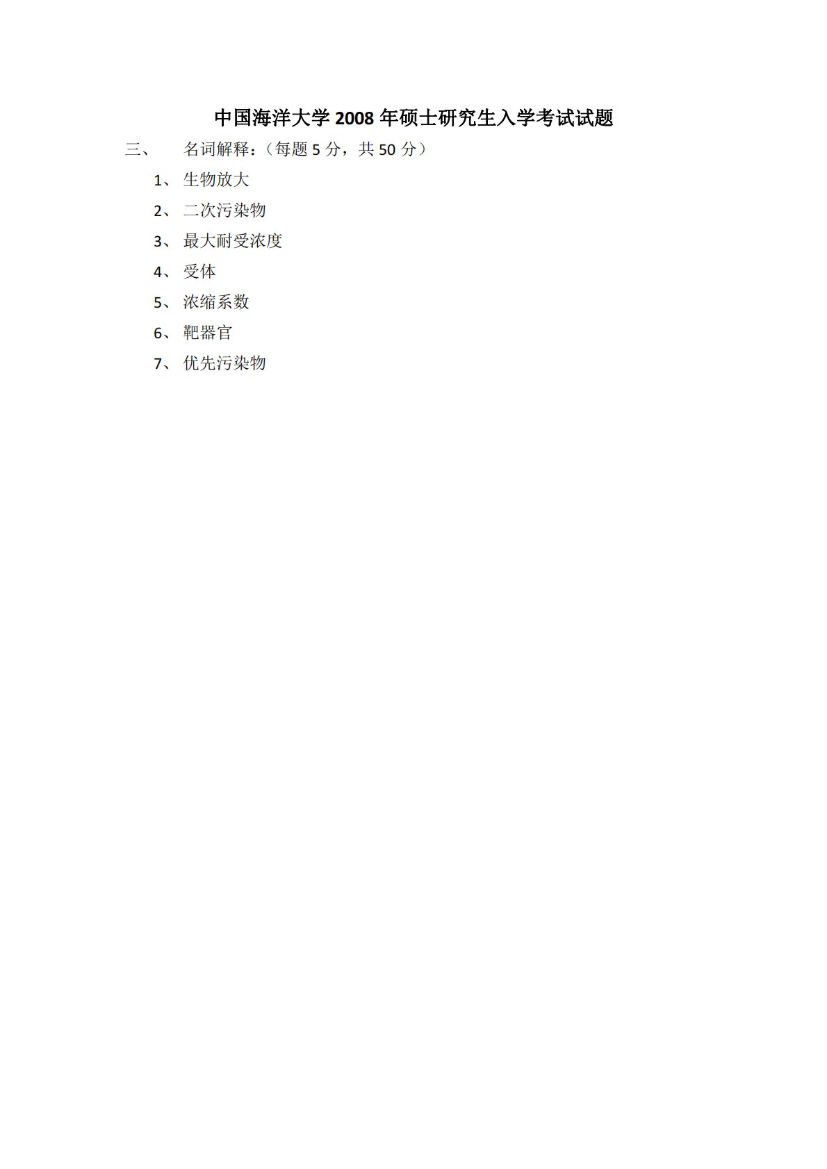 中国海洋大学2008年硕士研究生入学考试试题三、名词解释:(每题5分,共50分)1、生物放大2、二次污染物3、最大耐受浓度4、受体5、浓缩系数6、靶器官7、优先污染物中国海洋大学2008年硕士研究生入学考试试题三、名词解释:(每题5分,共50分)1、生物放大2、二次污染物3、最大耐受浓度4、受体5、浓缩系数6、靶器官7、优先污染物8、生物可利用性9、污染物的形态10、生物多样性四、简答题1、水环境质量生物学评价的主要方法有哪些?2、何为生物标志物?简述其在环境监测中的意义。3、简述活性污泥法进行污水处理的基本原理。4、什么是污染物的迁移?污染物在环境中有几种迁移方式?五、问答题1、试述外源化合...