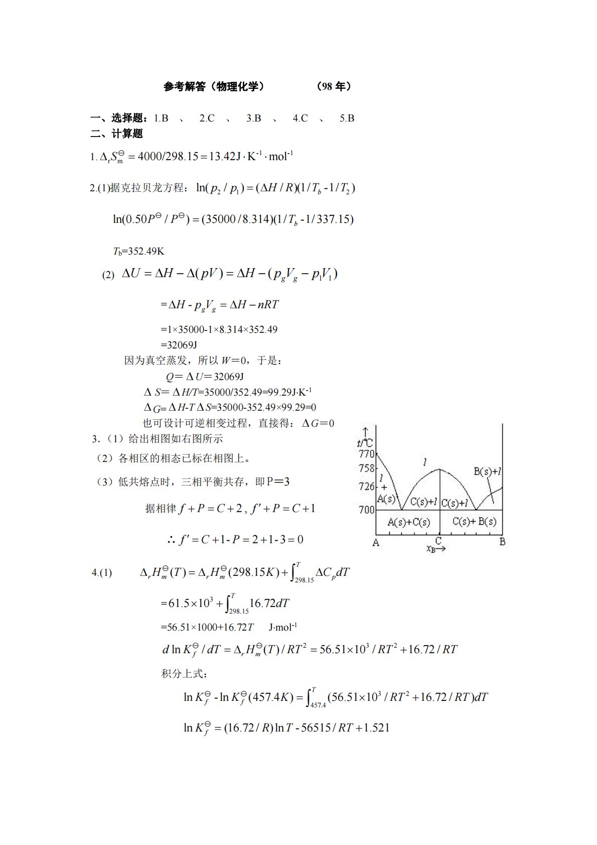 参考解答(物理化学)一、选择题:1.B、2.C、3.B、二、计算题(98年)4.C、5.B1.S4000/298.1513.42JK-1mol-1rm2.(1)据克拉贝龙方程:ln(/)(/)(1/-1/)212bppHRTTln(0.50/)(35000/8.314)(1/-1/337.15)bPPTTb=352.49K(2)UHpVHpVpV11()()gg=HpVHnRT-gg=1×35000-1×8.314×352.49=32069J因为真空蒸发,所以W=0,于是:Q=U=32069JS=H/T=35000/352.49=99.29...