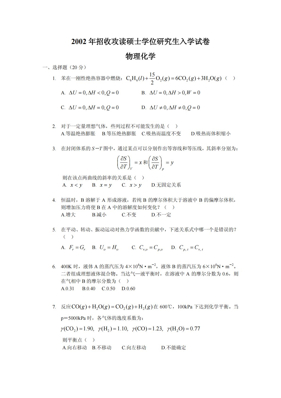 2002年招收攻读硕士学位研究生入学试卷物理化学一、选择题(20分)1.苯在一刚性绝热容器中燃烧:6622215CH()O()6CO()3HO()2lggg+=+()A.B.0,0,0UHQ∆=∆<=0,0,0UHW∆=∆>=C.D.0,0,0UHQ∆=∆==0,0,0UHQ∆≠∆≠=2.对于一定量理想气体,些列过程不可能发生的是()A.等温绝热膨胀B.等压绝热膨胀C.吸热而温度不变D.吸热而体积缩小3.在封闭体系的S-T图中,通过某点可以分别作出等容线和等压线,其斜率分别为:VSxT∂⎛⎞=⎜⎟∂⎝⎠和pSyT∂⎛⎞=⎜⎟∂⎝⎠则在该点两曲线的斜率的关系是()A.xy