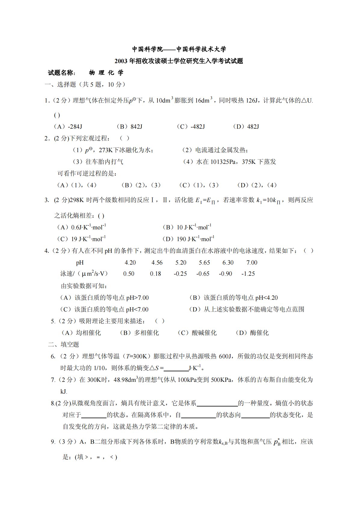 中国科学院——中国科学技术大学2003年招收攻读硕士学位研究生入学考试试题试题名称:物理化学一、选择题(共5题,10分)1.(2分)理想气体在恒定外压p下,从10dm3膨胀到16dm3,同时吸热126J,计算此气体的U.△()(A)-284J(B)842J(C)-482J(D)482J2.(2分)下列宏观过程:()(1)p,273K下冰融化为水;(2)电流通过金属发热;(3)往车胎内打气(4)水在101325Pa,375K下蒸发可看作可逆过程的是:(A)(1),(4)(B)(2),(3)(C)(1),(3)(D)(2),(4)3.(2分)298K时两个级数相同的反应Ⅰ,Ⅱ,活化能E=E...