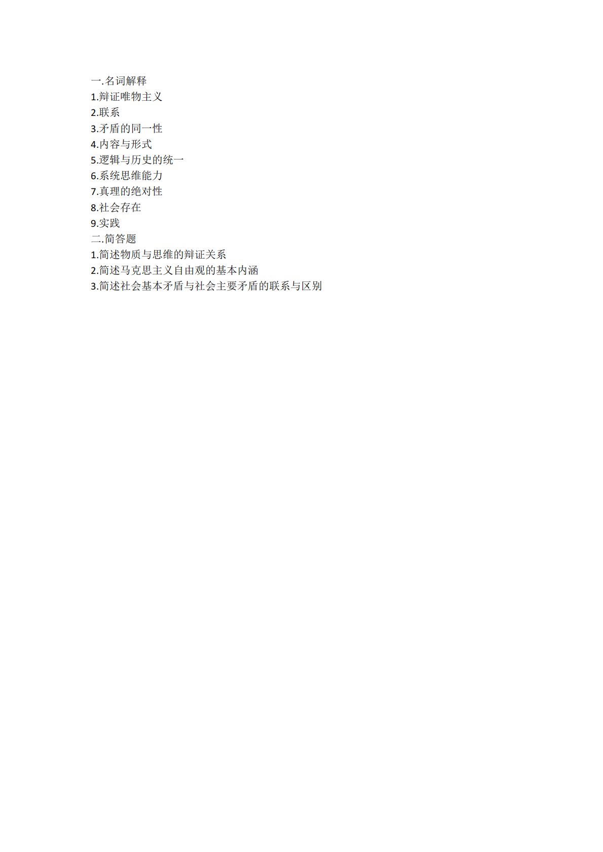 一.名词解释1.辩证唯物主义2.联系3.矛盾的同一性4.内容与形式5.逻辑与历史的统一6.系统思维能力7.真理的绝对性8.社会存在9.实践二.简答题1.简述物质与思维的辩证关系2.简述马克思主义自由观的基本内涵3.简述社会基本矛盾与社会主要矛盾的联系与区别一.名词解释1.辩证唯物主义2.联系3.矛盾的同一性4.内容与形式5.逻辑与历史的统一6.系统思维能力7.真理的绝对性8.社会存在9.实践二.简答题1.简述物质与思维的辩证关系2.简述马克思主义自由观的基本内涵3.简述社会基本矛盾与社会主要矛盾的联系与区别三.论述题1.请根据马克思恩格斯关于人类普遍交往和世界历史形成的基本理论,阐述“人类命运...