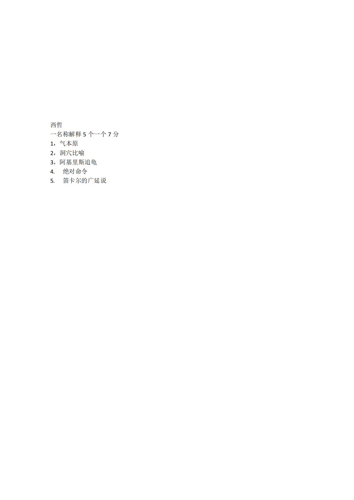 西哲一名称解释5个一个7分1,气本原2,洞穴比喻3,阿基里斯追龟4.绝对命令5.笛卡尔的广延说西哲一名称解释5个一个7分1,气本原2,洞穴比喻3,阿基里斯追龟4.绝对命令5.笛卡尔的广延说二:论述题一个15分1.斯宾诺莎的泛神论2,康德的先天性纯粹理性批判3,黑格尔绝对真理3简答一个35分1.休漠的归纳法2,一些人的看法,古代坚持世界本原论,近代坚持认识本体论百校文库—海量高校资料共享库百校文库是一个线上大学生专业学习资料共享平台,致力于通过用户自主上传与分享,打造一个涵盖各大高校、各学科门类的免费资源中心。平台已积累50万+套历年真题与100万+条学习文档,覆盖绝大多数高校专业,所有资料均由...