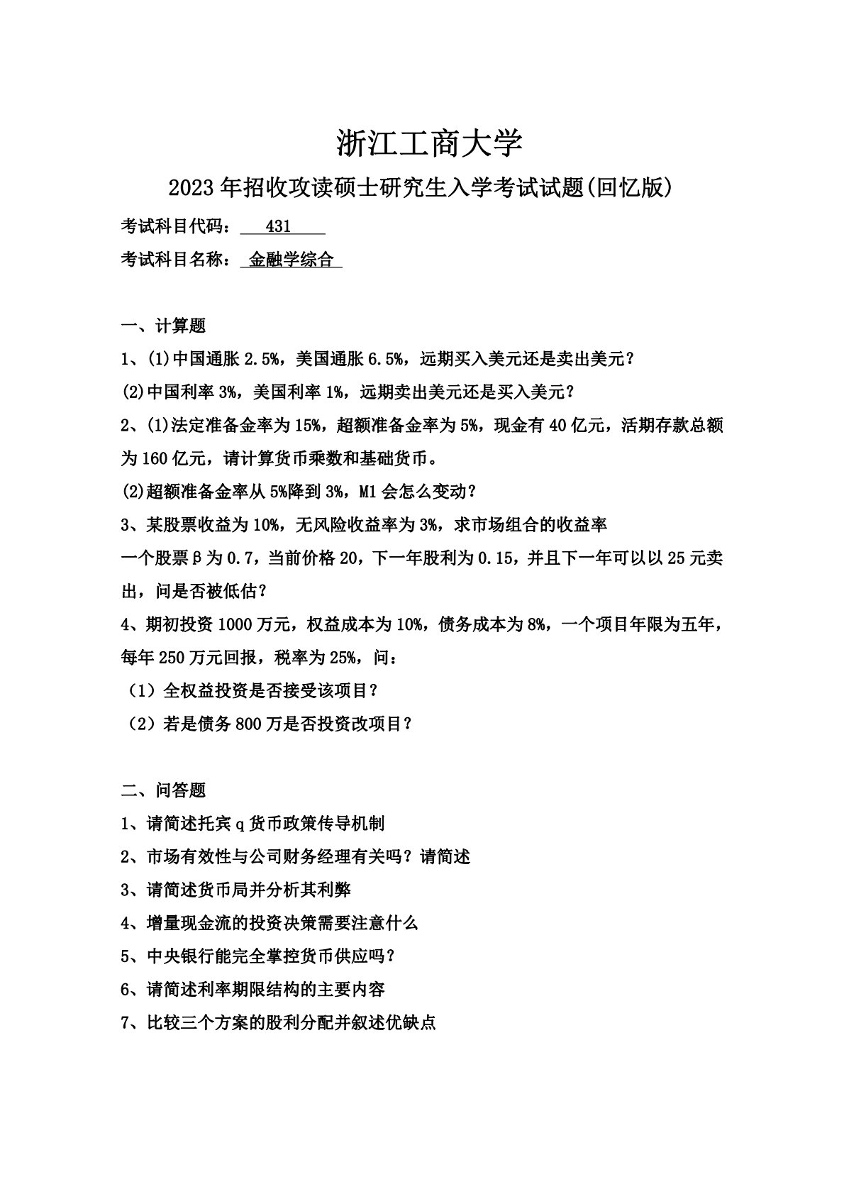 浙江工商大学431金融学综合2023年真题