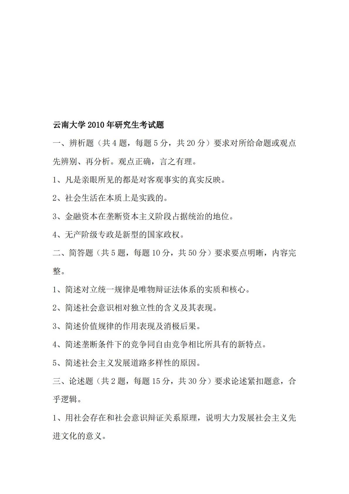 云南大学2010年研究生考试题一、辨析题(共4题,每题5分,共20分)要求对所给命题或观点先辨别、再分析。观点正确,言之有理。1、凡是亲眼所见的都是对客观事实的真实反映。2、社会生活在本质上是实践的。3、金融资本在垄断资本主义阶段占据统治的地位。4、无产阶级专政是新型的国家政权。二、简答题(共5题,每题10分,共50分)要求要点明晰,内容完整。1、简述对立统一规律是唯物辩证法体系的实质和核心。2、简述社会意识相对独立性的含义及其表现。3、简述价值规律的作用表现及消极后果。4、简述垄断条件下的竞争同自由竞争相比所具有的新特点。5、简述社会主义发展道路多样性的原因。三、论述题(共2题,每题15分,...