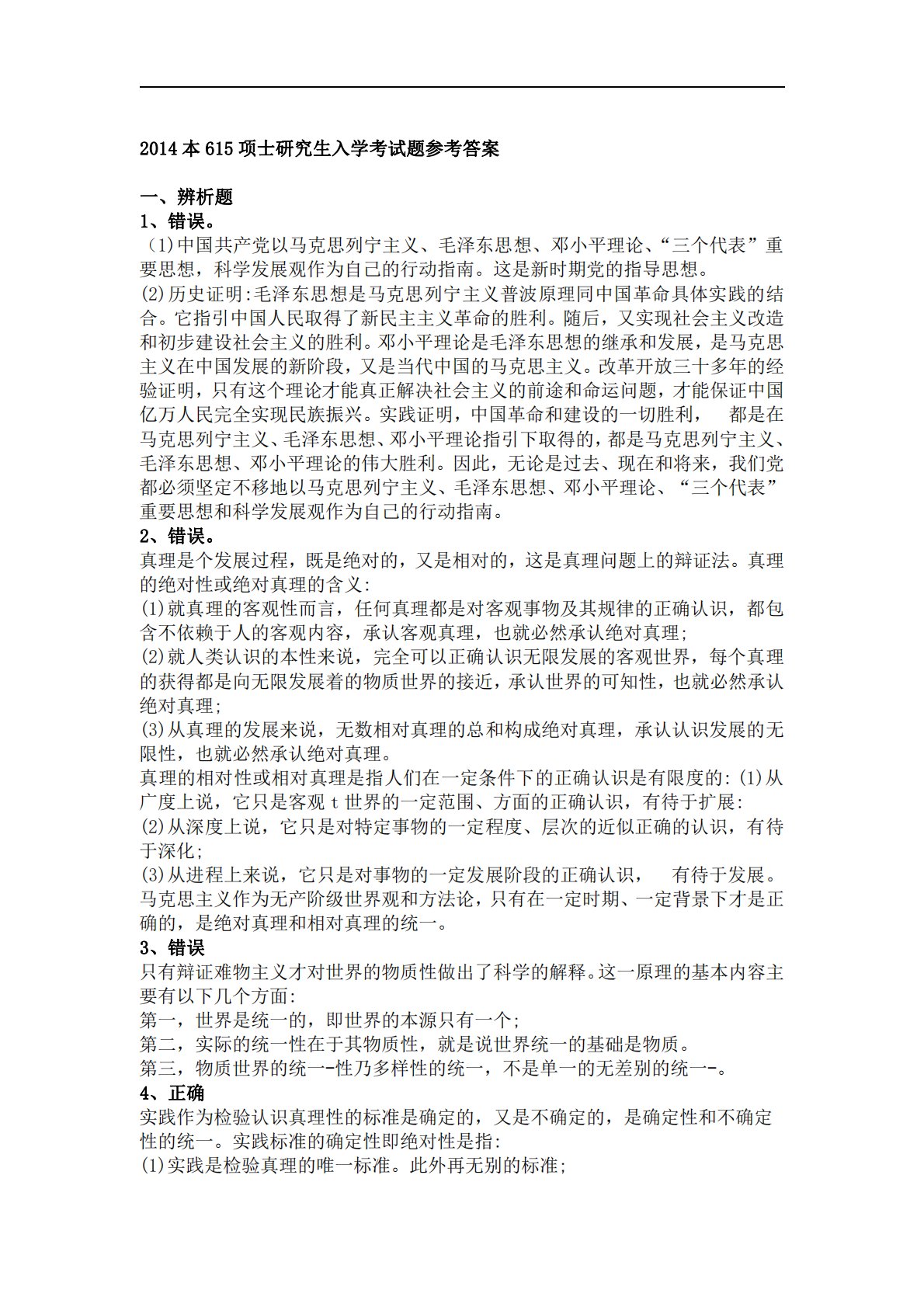 2014本615项士研究生入学考试题参考答案一、辨析题1、错误。(1)中国共产党以马克思列宁主义、毛泽东思想、邓小平理论、“三个代表”重要思想,科学发展观作为自己的行动指南。这是新时期党的指导思想。(2)历史证明:毛泽东思想是马克思列宁主义普波原理同中国革命具体实践的结合。它指引中国人民取得了新民主主义革命的胜利。随后,又实现社会主义改造和初步建设社会主义的胜利。邓小平理论是毛泽东思想的继承和发展,是马克思主义在中国发展的新阶段,又是当代中国的马克思主义。改革开放三十多年的经验证明,只有这个理论才能真正解决社会主义的前途和命运问题,才能保证中国亿万人民完全实现民族振兴。实践证明,中国革命和建设...