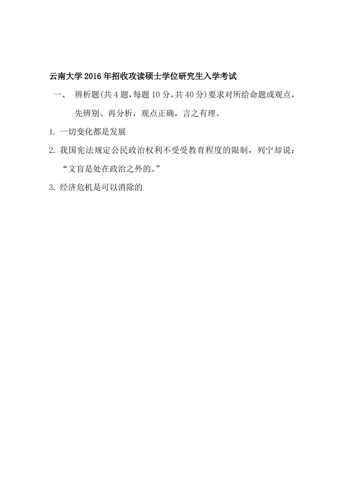 云南大学2016年招收攻读硕士学位研究生入学考试一、辨析题(共4题,每题10分,共40分)要求对所给命题或观点,先辨别、再分析,观点正确,言之有理。1.一切变化都是发展2.我国宪法规定公民政治权利不受受教育程度的限制,列宁却说:“文盲是处在政治之外的。”3.经济危机是可以消除的云南大学2016年招收攻读硕士学位研究生入学考试4.社会主义发展道路二、简答题:(共5题,每题10分,共50分)1.马克思主义鲜明的政治立场2.价值评价的特点3.评价历史人物的原则一、辨析题(共4题,每题10分,共40分)要求对所给命题或观点,先辨别、再分析,观点正确,言之有理。1.一切变化都是发展2.我国宪法规定公民政...