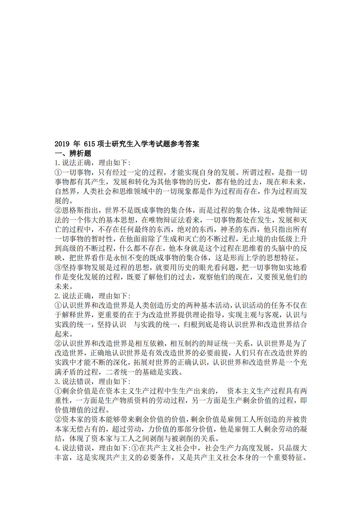 2019年615项士研究生入学考试题参考答案一、辨析题1.说法正确,理由如下:①一切事物,只有经过一定的过程,才能实现自身的发展。所谓过程,是指一切事物都有其产生,发展和转化为其他事物的历史,都有他的过去,现在和未来,自然界,人类社会和思维领域中的一切现象都是作为过程而存在,作为过程而发展的。②恩格斯指出,世界不是既成事物的集合体,而是过程的集合体,这是唯物辩证法的一个伟大的基本思想,在唯物辩证法看来,一切事物都处在发生,发展和灭亡的过程中,不存在任何最终的东西,绝对的东西,神圣的东西,他只指出所有一切事物的暂时性,在他面前除了生成和灭亡的不断过程,无止境的由低级上升到高级的不断过程,什么都不...