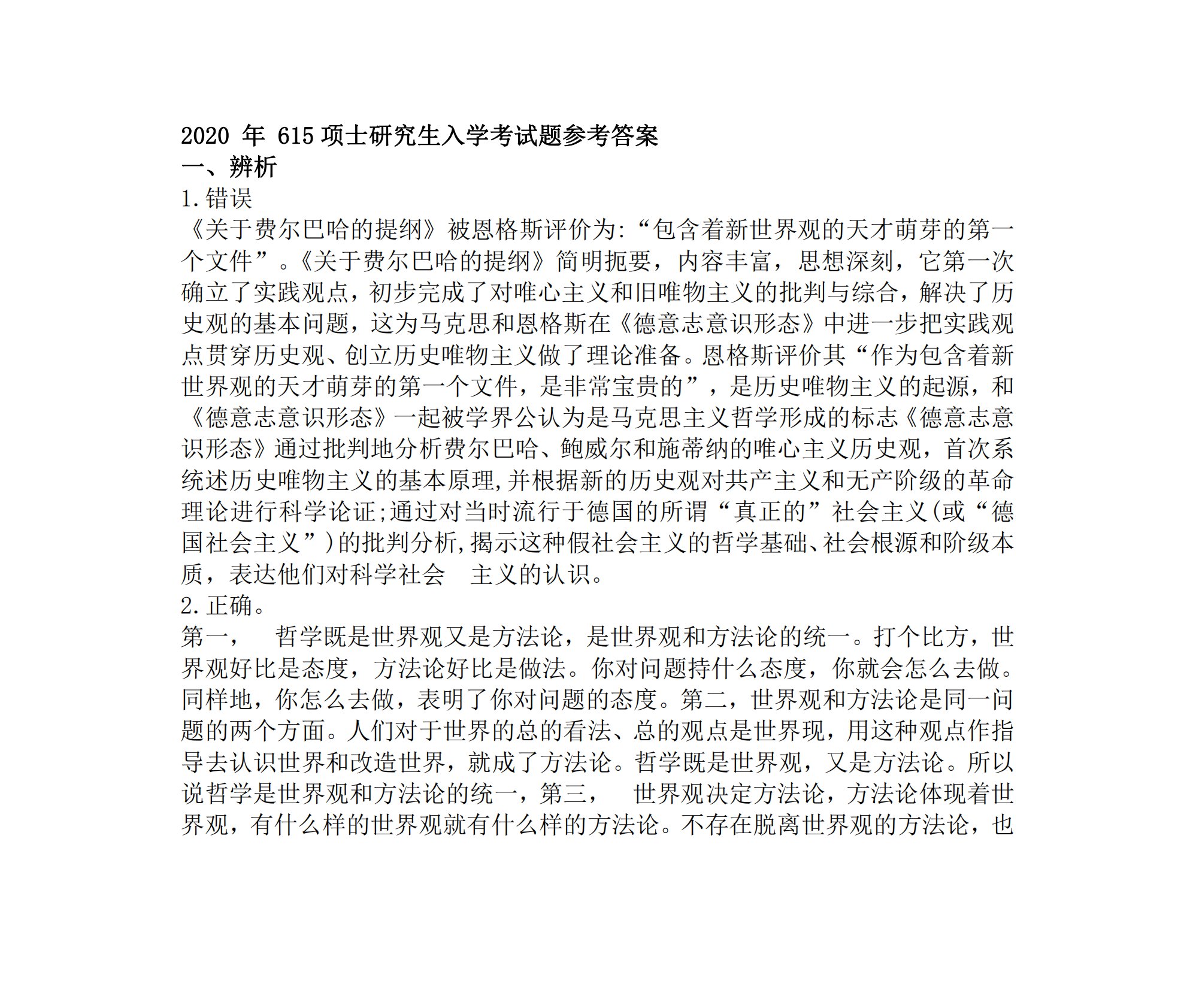 2020年615项士研究生入学考试题参考答案一、辨析1.错误《关于费尔巴哈的提纲》被恩格斯评价为:“包含着新世界观的天才萌芽的第一个文件”。《关于费尔巴哈的提纲》简明扼要,内容丰富,思想深刻,它第一次确立了实践观点,初步完成了对唯心主义和旧唯物主义的批判与综合,解决了历史观的基本问题,这为马克思和恩格斯在《德意志意识形态》中进一步把实践观点贯穿历史观、创立历史唯物主义做了理论准备。恩格斯评价其“作为包含着新世界观的天才萌芽的第一个文件,是非常宝贵的”,是历史唯物主义的起源,和《德意志意识形态》一起被学界公认为是马克思主义哲学形成的标志《德意志意识形态》通过批判地分析费尔巴哈、鲍威尔和施蒂纳的唯...