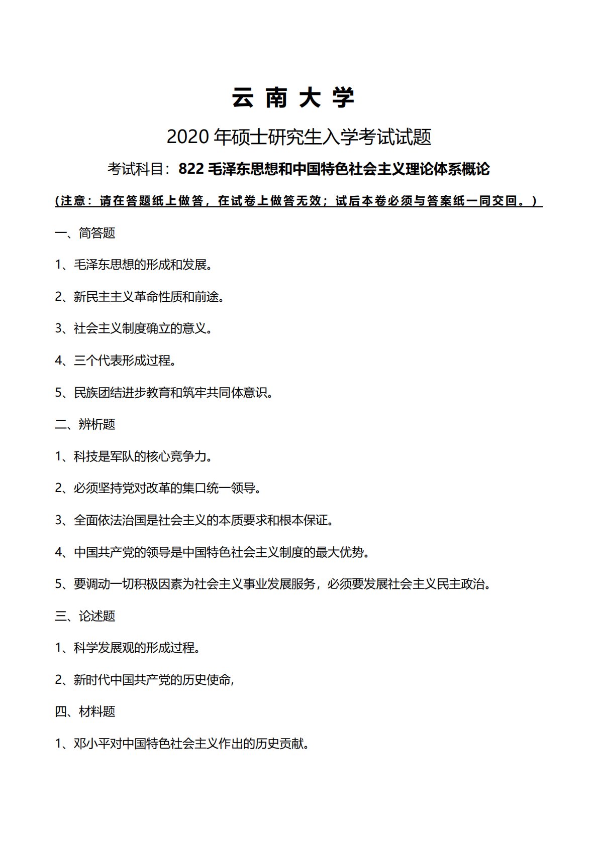云南大学2020年硕士研究生入学考试试题考试科目:822毛泽东思想和中国特色社会主义理论体系概论(注意:请在答题纸上做答,在试卷上做答无效;试后本卷必须与答案纸一同交回。)一、简答题1、毛泽东思想的形成和发展。2、新民主主义革命性质和前途。3、社会主义制度确立的意义。4、三个代表形成过程。5、民族团结进步教育和筑牢共同体意识。二、辨析题1、科技是军队的核心竞争力。2、必须坚持党对改革的集口统一领导。3、全面依法治国是社会主义的本质要求和根本保证。4、中国共产党的领导是中国特色社会主义制度的最大优势。5、要调动一切积极因素为社会主义事业发展服务,必须要发展社会主义民主政治。三、论述题1、科学发展...