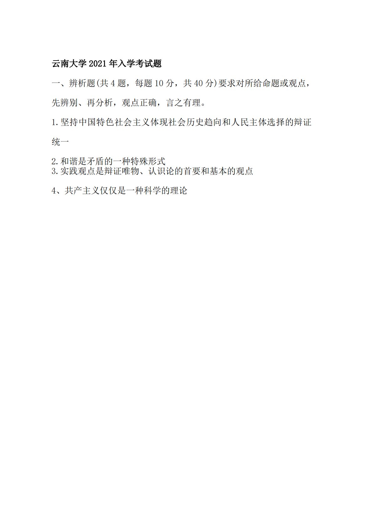 云南大学2021年入学考试题一、辨析题(共4题,每题10分,共40分)要求对所给命题或观点,先辨别、再分析,观点正确,言之有理。1.坚持中国特色社会主义体现社会历史趋向和人民主体选择的辩证统一2.和谐是矛盾的一种特殊形式3.实践观点是辩证唯物、认识论的首要和基本的观点4、共产主义仅仅是一种科学的理论1.真理与谬误是人类认识发展过程中的一对永恒矛盾,它们是对立统一的2.马克思主义的鲜明特征,如果用一句话来概括就是科学性与革命性云南大学2021年入学考试题一、辨析题(共4题,每题10分,共40分)要求对所给命题或观点,先辨别、再分析,观点正确,言之有理。1.坚持中国特色社会主义体现社会历史趋向和人...