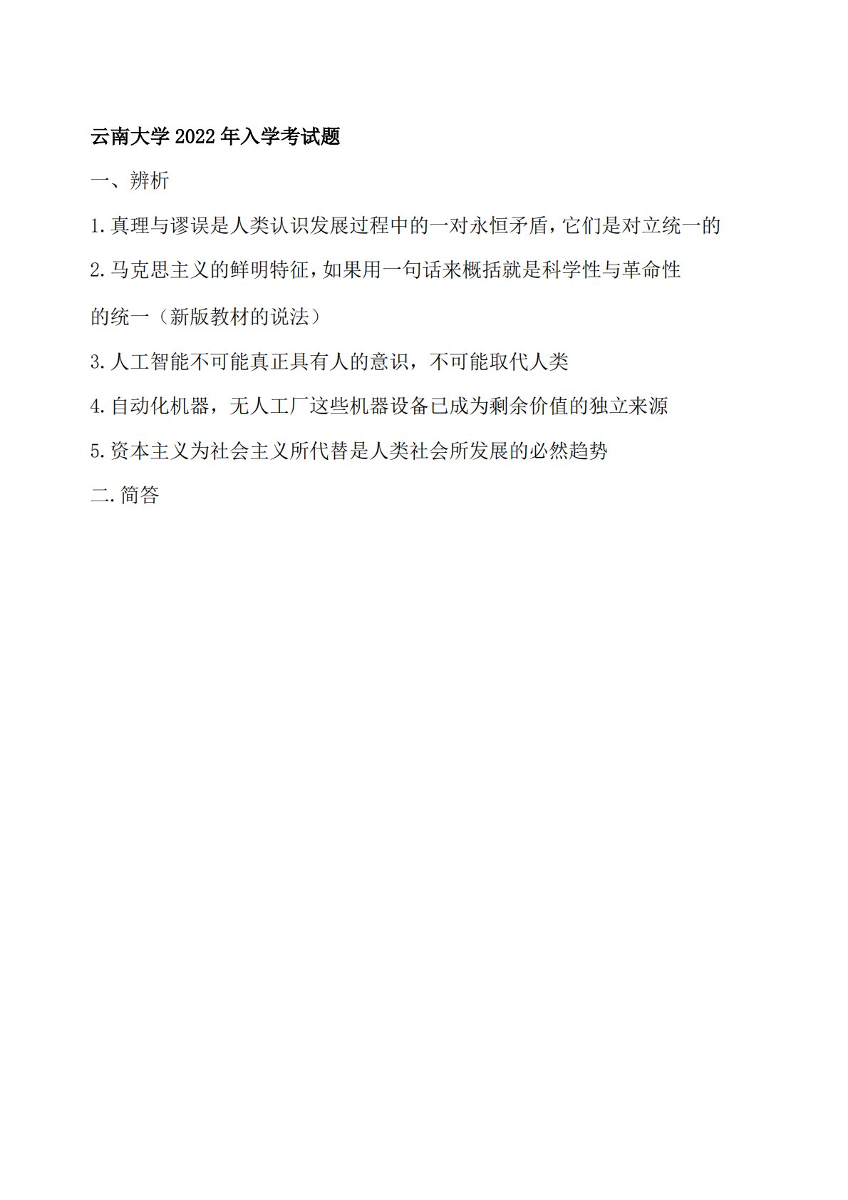 的统一(新版教材的说法)3.人工智能不可能真正具有人的意识,不可能取代人类4.自动化机器,无人工厂这些机器设备已成为剩余价值的独立来源5.资本主义为社会主义所代替是人类社会所发展的必然趋势二.简答云南大学2022年入学考试题一、辨析1.真理与谬误是人类认识发展过程中的一对永恒矛盾,它们是对立统一的2.马克思主义的鲜明特征,如果用一句话来概括就是科学性与革命性的统一(新版教材的说法)3.人工智能不可能真正具有人的意识,不可能取代人类4.自动化机器,无人工厂这些机器设备已成为剩余价值的独立来源5.资本主义为社会主义所代替是人类社会所发展的必然趋势二.简答1.文化的作用2.科学实践观的形成和发展及其...