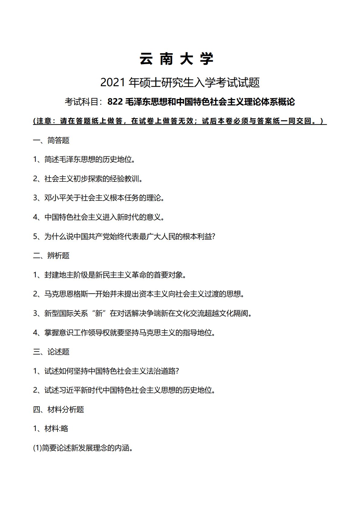云南大学2021年硕士研究生入学考试试题考试科目:822毛泽东思想和中国特色社会主义理论体系概论(注意:请在答题纸上做答,在试卷上做答无效;试后本卷必须与答案纸一同交回。)一、简答题1、简述毛泽东思想的历史地位。2、社会主义初步探索的经验教训。3、邓小平关于社会主义根本任务的理论。4、中国特色社会主义进入新时代的意义。5、为什么说中国共产党始终代表最广大人民的根本利益?二、辨析题1、封建地主阶级是新民主主义革命的首要对象。2、马克思恩格斯一开始并未提出资本主义向社会主义过渡的思想。3、新型国际关系“新”在对话解决争端新在文化交流超越文化隔阂。4、掌握意识工作领导权就要坚持马克思主义的指导地位。...