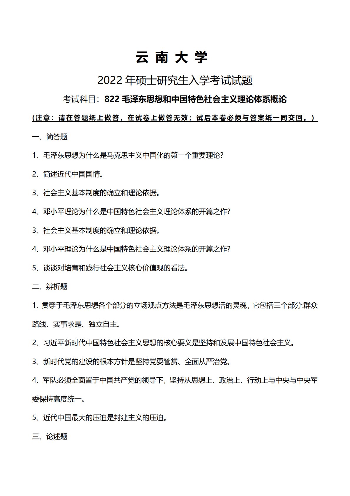 云南大学2022年硕士研究生入学考试试题考试科目:822毛泽东思想和中国特色社会主义理论体系概论(注意:请在答题纸上做答,在试卷上做答无效;试后本卷必须与答案纸一同交回。)一、简答题1、毛泽东思想为什么是马克思主义中国化的第一个重要理论?2、简述近代中国国情。3、社会主义基本制度的确立和理论依据。4、邓小平理论为什么是中国特色社会主义理论体系的开篇之作?3、社会主义基本制度的确立和理论依据。4、邓小平理论为什么是中国特色社会主义理论体系的开篇之作?5、谈谈对培育和践行社会主义核心价值观的看法。二、辨析题1、贯穿于毛泽东思想各个部分的立场观点方法是毛泽东思想活的灵魂,它包括三个部分:群众路线、实...