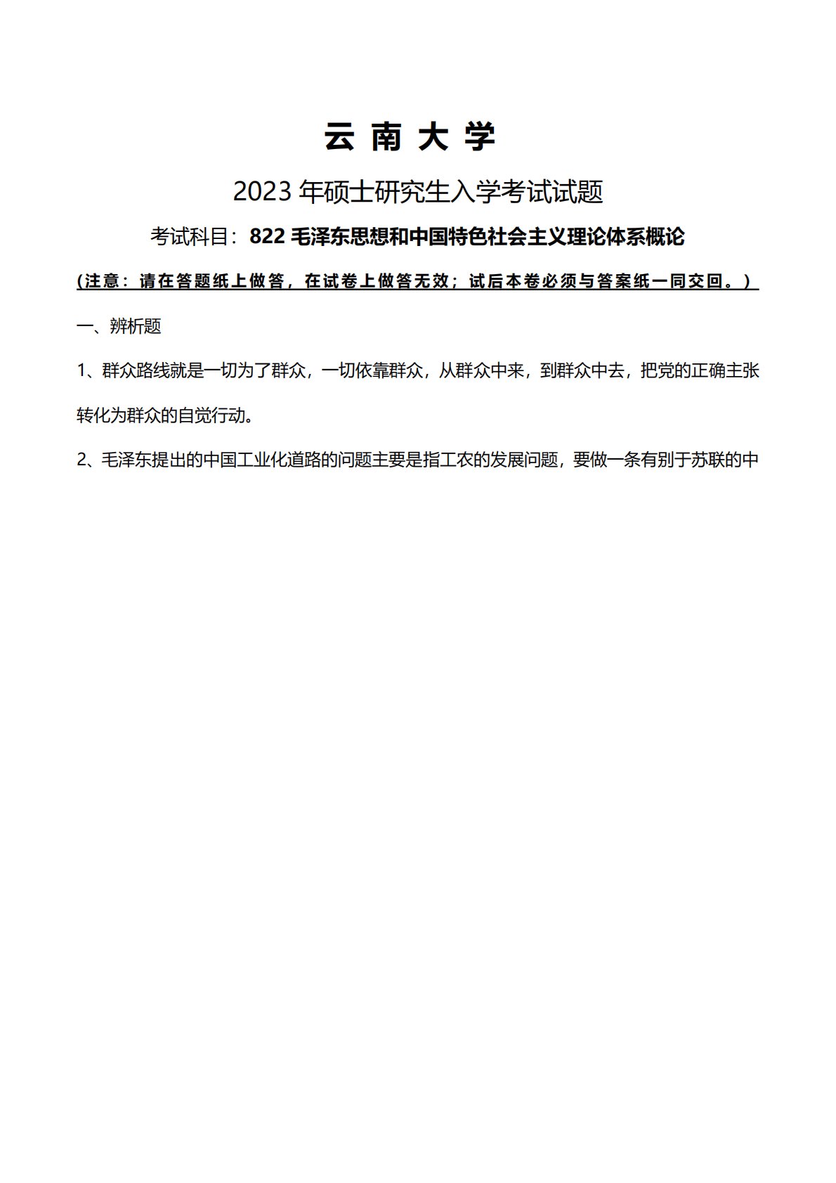 云南大学2023年硕士研究生入学考试试题考试科目:822毛泽东思想和中国特色社会主义理论体系概论(注意:请在答题纸上做答,在试卷上做答无效;试后本卷必须与答案纸一同交回。)一、辨析题1、群众路线就是一切为了群众,一切依靠群众,从群众中来,到群众中去,把党的正确主张转化为群众的自觉行动。2、毛泽东提出的中国工业化道路的问题主要是指工农的发展问题,要做一条有别于苏联的中云南大学2023年硕士研究生入学考试试题考试科目:822毛泽东思想和中国特色社会主义理论体系概论(注意:请在答题纸上做答,在试卷上做答无效;试后本卷必须与答案纸一同交回。)一、辨析题1、群众路线就是一切为了群众,一切依靠群众,从群众...