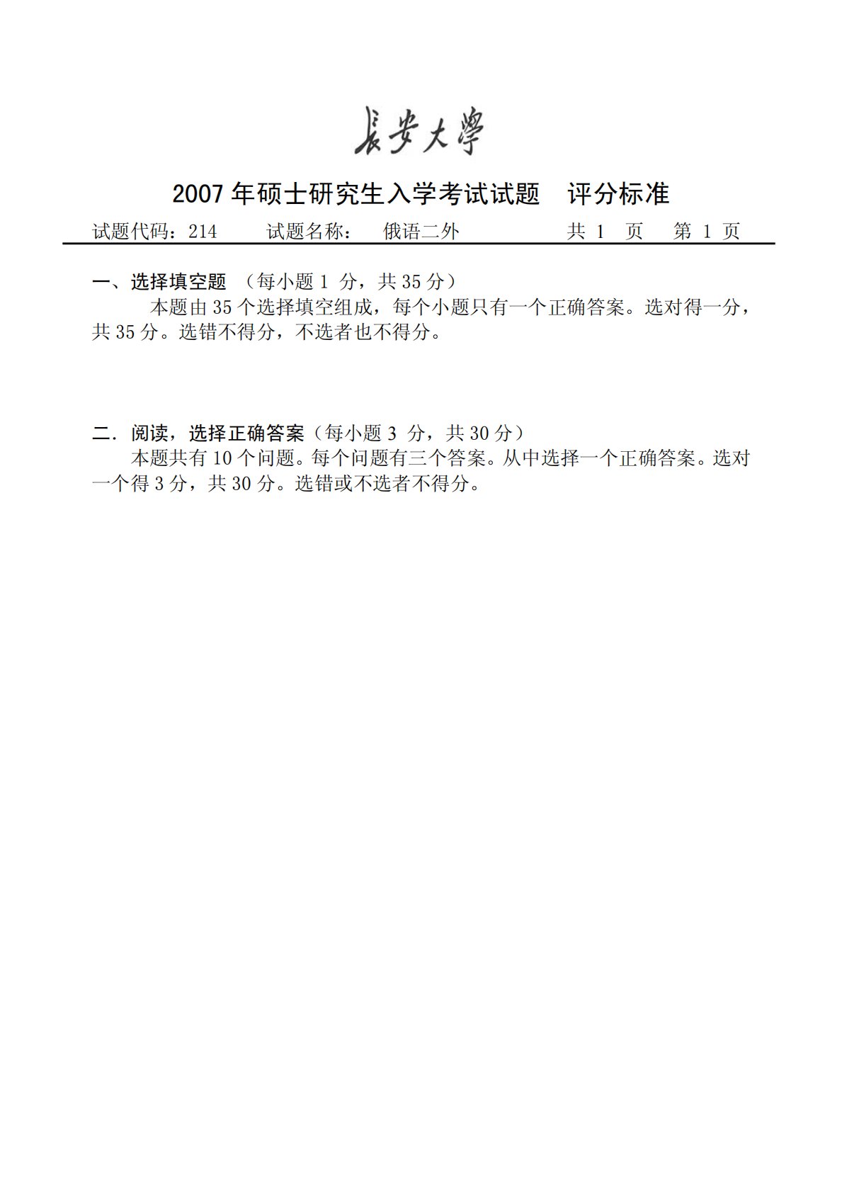 2007年硕士研究生入学考试试题评分标准试题代码:214试题名称:俄语二外共1页第1页一、选择填空题(每小题1分,共35分)本题由35个选择填空组成,每个小题只有一个正确答案。选对得一分,共35分。选错不得分,不选者也不得分。二.阅读,选择正确答案(每小题3分,共30分)本题共有10个问题。每个问题有三个答案。从中选择一个正确答案。选对一个得3分,共30分。选错或不选者不得分。2007年硕士研究生入学考试试题评分标准试题代码:214试题名称:俄语二外共1页第1页一、选择填空题(每小题1分,共35分)本题由35个选择填空组成,每个小题只有一个正确答案。选对得一分,共35分。选错不得分,不选者也不...