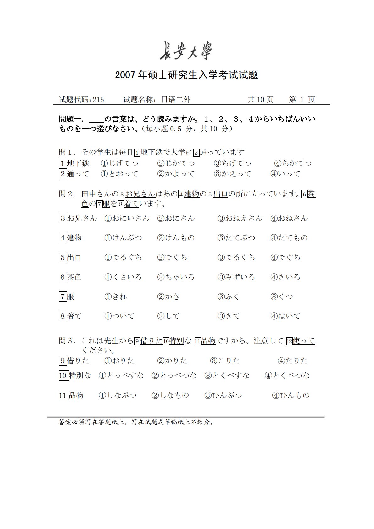 2007年硕士研究生入学考试试题试题代码:215试题名称:日语二外共10页第1页問題一.__の言葉は、どう読みますか。1、2、3、4からいちばんいいものを一つ選びなさい。(每小题0.5分,共10分)問1.その学生は毎日1地下鉄で大学に2通っています1地下鉄①じげてつ②じかてつ③ちげてつ④ちかてつ2通って①とおって②かよって③かえって④いって問2.田中さんの3お兄さんはあの4建物の5出口の所に立っています。6茶色の7服を8着ています。3お兄さん①おにいさん②おにさん③おねえさん④おねさん4建物①けんぶつ②けんもの③たてぶつ④たてもの5出口①でるぐち②でくち③でるくち④でぐち6茶色①くさいろ②ちゃ...