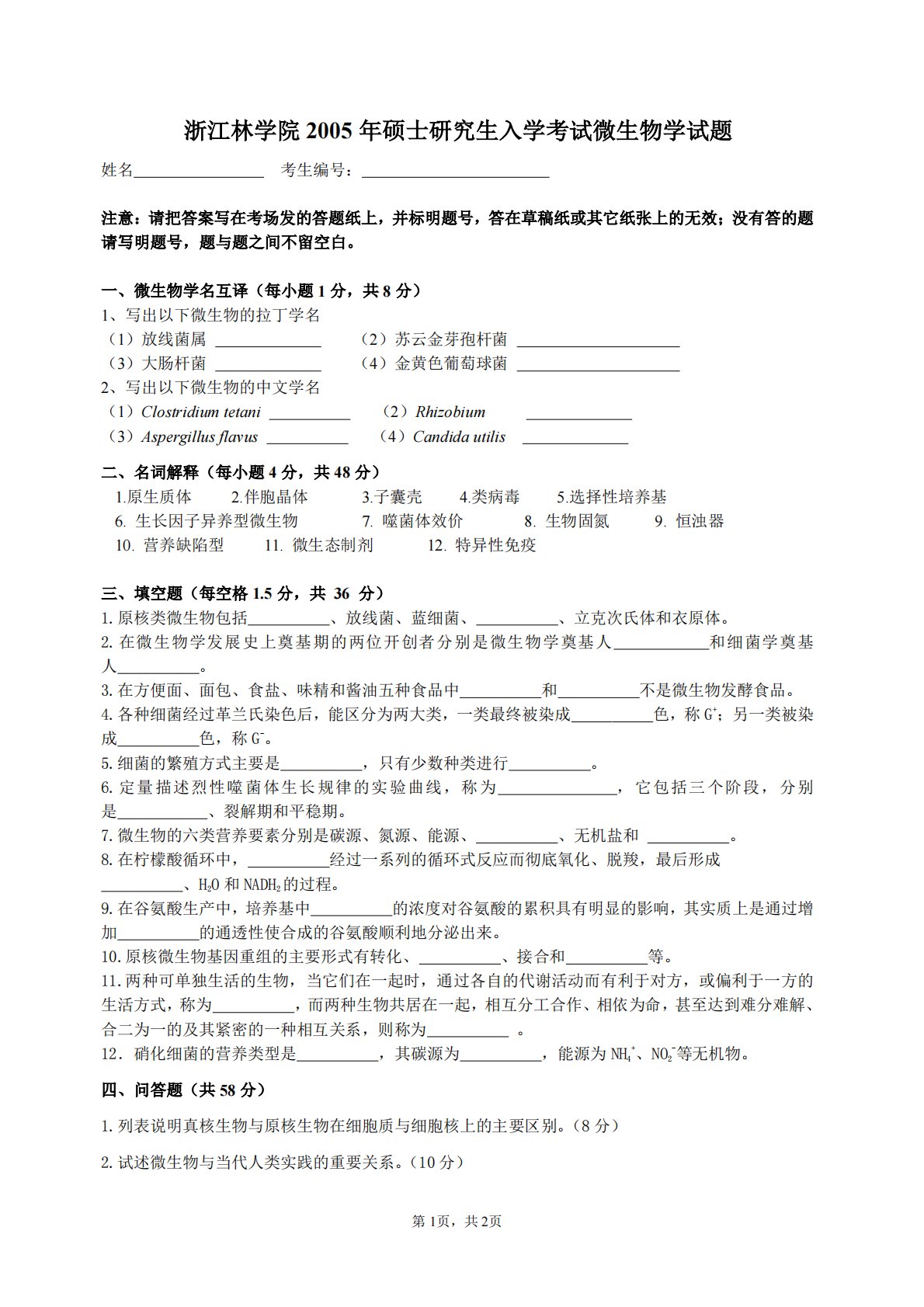 第1页,共2页姓浙江林学院2005年硕士研究生入学考试微生物学试题名考生编号:注意:请把答案写在考场发的答题纸上,并标明题号,答在草稿纸或其它纸张上的无效;没有答的题请写明题号,题与题之间不留空白。一、微生物学名互译(每小题1分,共8分)1、写出以下微生物的拉丁学名(1)放线菌属(2)苏云金芽孢杆菌(3)大肠杆菌(4)金黄色葡萄球菌2、写出以下微生物的中文学名(1)Clostridiumtetani(2)Rhizobium(3)Aspergillusflavus(4)Candidautilis二、名词解释(每小题4分,共48分)1.原生质体2.伴胞晶体3.子囊壳4.类病毒5.选择性培养基6.生...