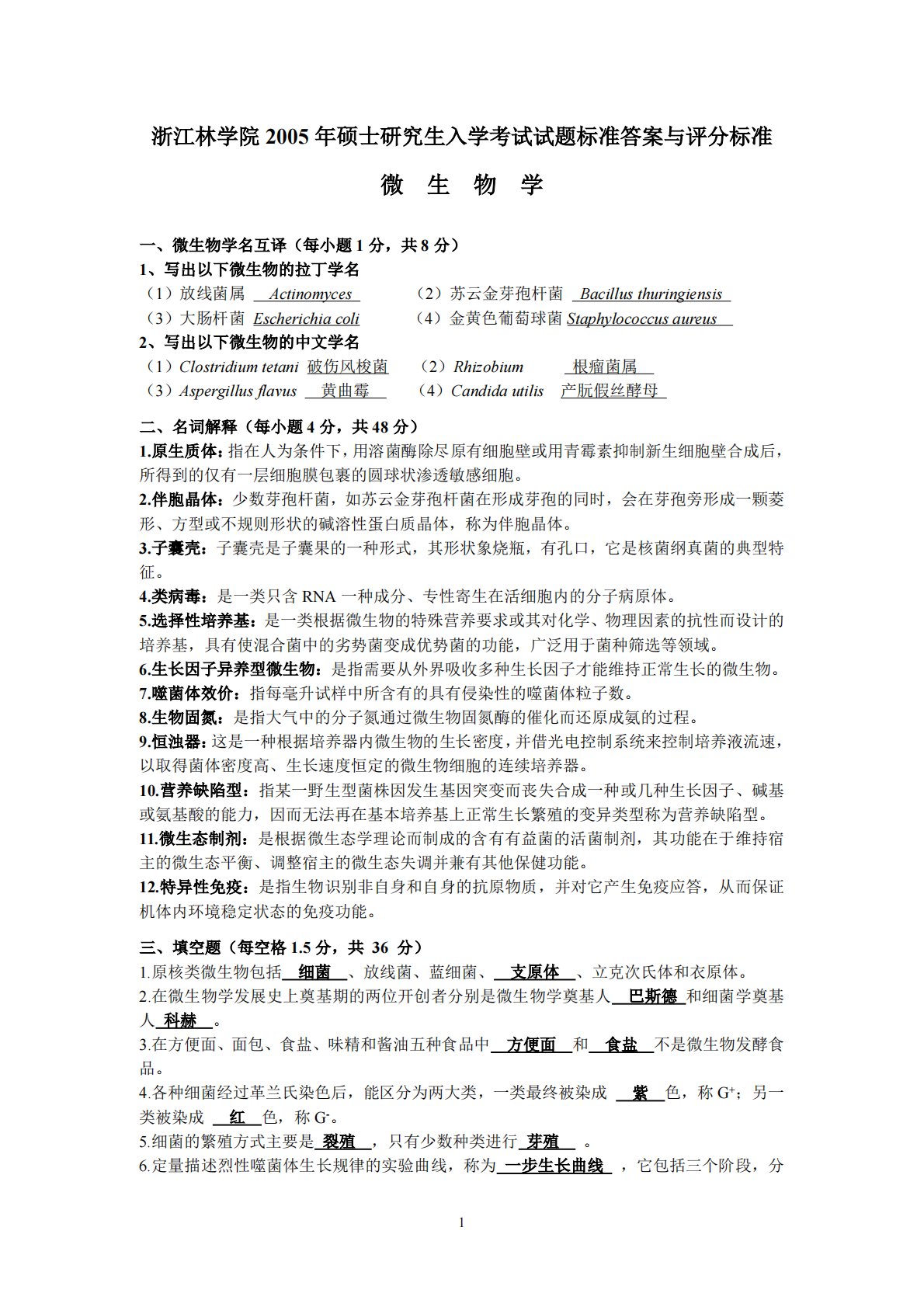 1浙江林学院2005年硕士研究生入学考试试题标准答案与评分标准微生物学一、微生物学名互译(每小题1分,共8分)1、写出以下微生物的拉丁学名(1)放线菌属Actinomyces(2)苏云金芽孢杆菌Bacillusthuringiensis(3)大肠杆菌Escherichiacoli(4)金黄色葡萄球菌Staphylococcusaureus2、写出以下微生物的中文学名(1)Clostridiumtetani破伤风梭菌(2)Rhizobium根瘤菌属(3)Aspergillusflavus黄曲霉(4)Candidautilis产朊假丝酵母二、名词解释(每小题4分,共48分)1.原生质体:指在人为条...