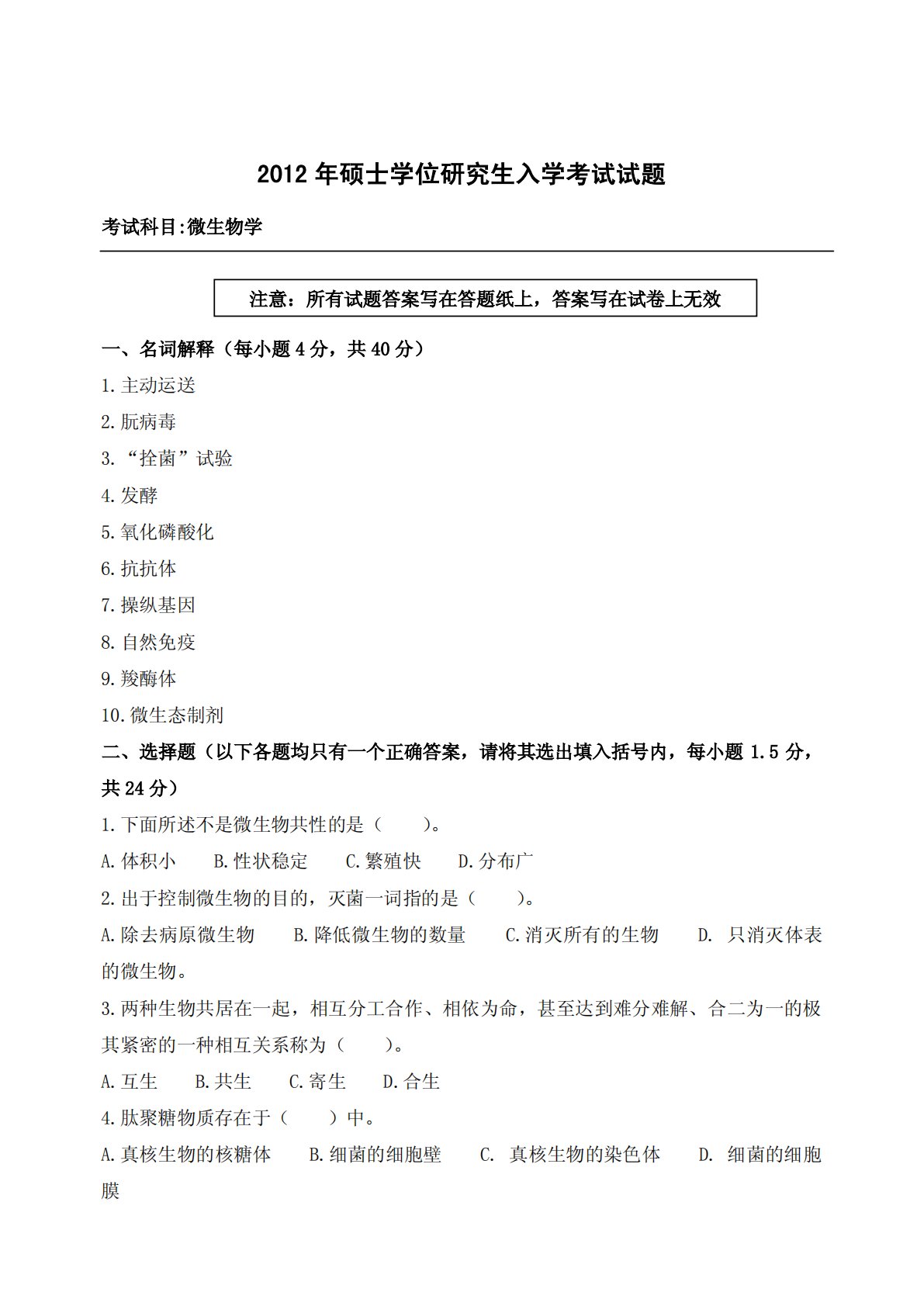 2012年硕士学位研究生入学考试试题考试科目:微生物学一、名词解释(每小题4分,共40分)1.主动运送2.朊病毒3.“拴菌”试验4.发酵5.氧化磷酸化6.抗抗体7.操纵基因8.自然免疫9.羧酶体10.微生态制剂二、选择题(以下各题均只有一个正确答案,请将其选出填入括号内,每小题1.5分,共24分)1.下面所述不是微生物共性的是()。A.体积小B.性状稳定C.繁殖快D.分布广2.出于控制微生物的目的,灭菌一词指的是()。A.除去病原微生物B.降低微生物的数量C.消灭所有的生物D.只消灭体表的微生物。3.两种生物共居在一起,相互分工合作、相依为命,甚至达到难分难解、合二为一的极其紧密的一种相互关系...