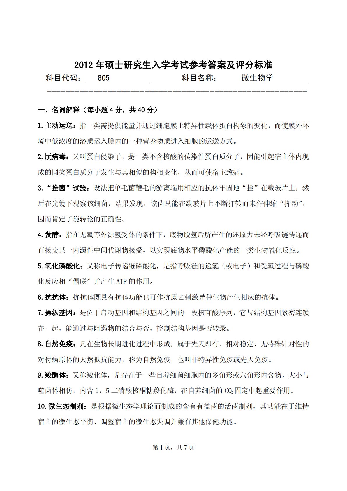 第1页,共7页2012年硕士研究生入学考试参考答案及评分标准科目代码:805科目名称:微生物学--------------------------------------------------------一、名词解释(每小题4分,共40分)1.主动运送:指一类需提供能量并通过细胞膜上特异性载体蛋白构象的变化,而使膜外环境中低浓度的溶质运入膜内的一种营养物质进入细胞的运送方式。2.朊病毒:又叫蛋白侵染子,是一类不含核酸的传染性蛋白质分子,因能引起宿主体内现成的同类蛋白质分子发生与其相似的构相变化,从而可使宿主致病。3.“拴菌”试验:设法把单毛菌鞭毛的游离端用相应的抗体牢固地“拴”在载玻片上,然...