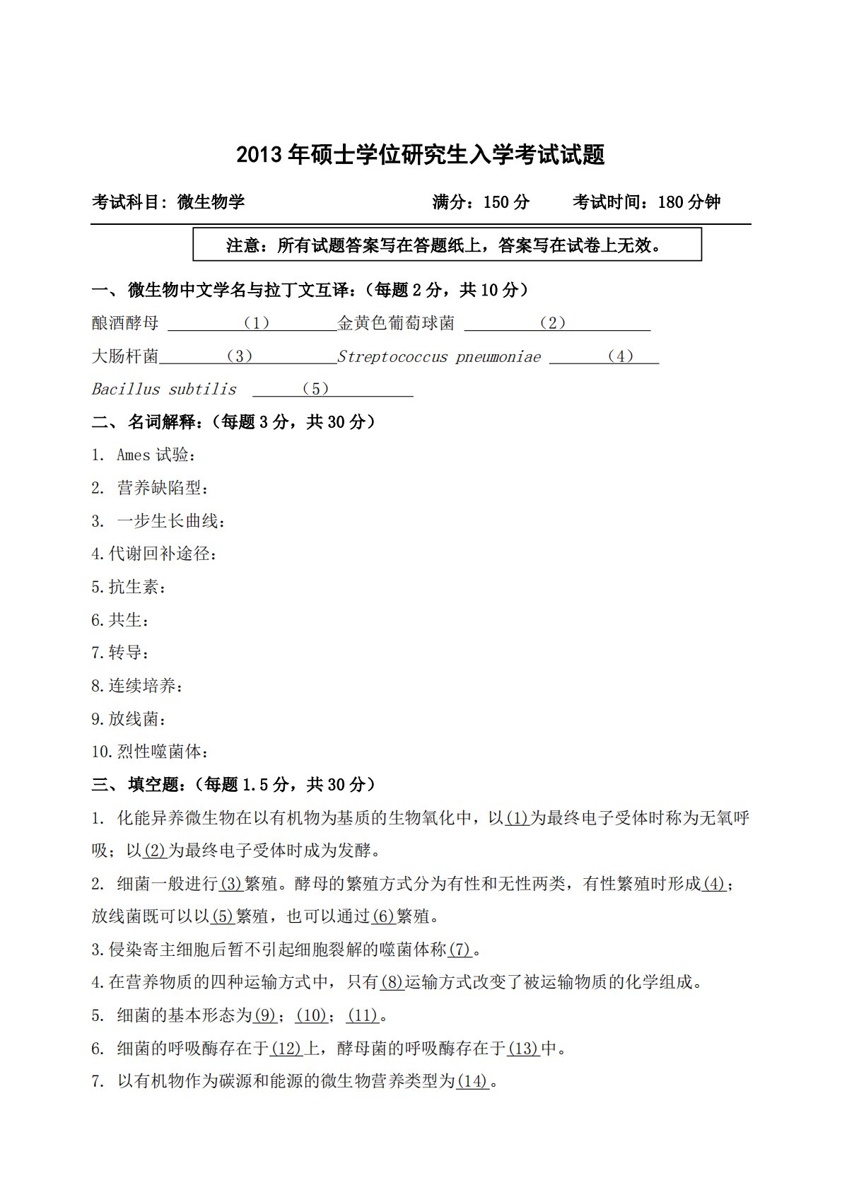 2013年硕士学位研究生入学考试试题考试科目:微生物学满分:150分考试时间:180分钟一、微生物中文学名与拉丁文互译:(每题2分,共10分)酿酒酵母(1)金黄色葡萄球菌(2)大肠杆菌(3)Streptococcuspneumoniae(4)Bacillussubtilis(5)枯草芽孢杆菌二、名词解释:(每题3分,共30分)1.Ames试验:2.营养缺陷型:3.一步生长曲线:4.代谢回补途径:5.抗生素:6.共生:7.转导:8.连续培养:9.放线菌:10.烈性噬菌体:三、填空题:(每题1.5分,共30分)1.化能异养微生物在以有机物为基质的生物氧化中,以(1)为最终电子受体时称为无氧呼吸;以...