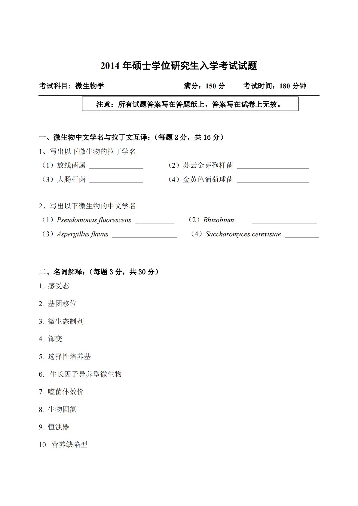 2014年硕士学位研究生入学考试试题考试科目:微生物学满分:150分考试时间:180分钟一、微生物中文学名与拉丁文互译:(每题2分,共16分)1、写出以下微生物的拉丁学名(1)放线菌属(2)苏云金芽孢杆菌(3)大肠杆菌(4)金黄色葡萄球菌2、写出以下微生物的中文学名(1)Pseudomonasfluorescens(2)Rhizobium(3)Aspergillusflavus(4)Saccharomycescerevisiae草芽孢杆菌二、名词解释:(每题3分,共30分)1.感受态2.基团移位3.微生态制剂4.饰变5.选择性培养基6.生长因子异养型微生物7.噬菌体效价8.生物固氮9.恒浊器1...
