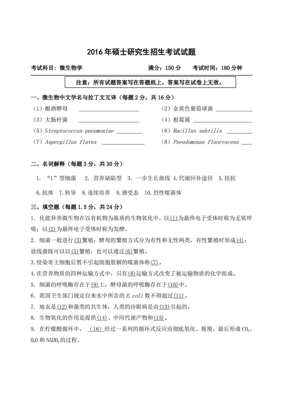 2016年硕士研究生招生考试试题考试科目:微生物学满分:150分考试时间:180分钟一、微生物中文学名与拉丁文互译(每题2分,共16分)(1)酿酒酵母(2)金黄色葡萄球菌(3)大肠杆菌E(4)根霉属(5)Streptococcuspneumoniae(6)Bacillussubtilis(7)Aspergillusflavus肺炎(8)Pseudomonasfluorescens二、名词解释(每题3分,共30分)1.“L”型细菌2.营养缺陷型3.一步生长曲线4.代谢回补途径5.拮抗6.抗体7.转导8.连续培养9.感受态10.烈性噬菌体三、填空题(每题1.5分,共24分)1.化能异养微生物在以有...