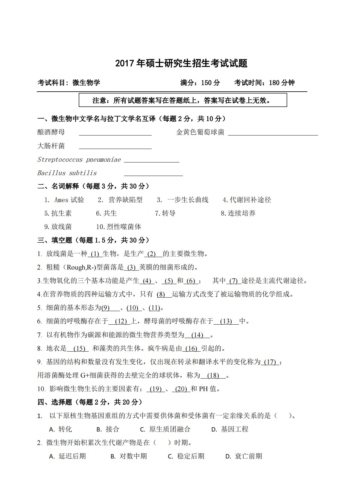 2017年硕士研究生招生考试试题考试科目:微生物学满分:150分考试时间:180分钟一、微生物中文学名与拉丁文学名互译(每题2分,共10分)酿酒酵母金黄色葡萄球菌大肠杆菌EStreptococcuspneumoniae肺炎链球Bacillussubtilis枯二、名词解释(每题3分,共30分)1.Ames试验2.营养缺陷型3.一步生长曲线4.代谢回补途径5.抗生素6.共生7.转导8.连续培养9.放线菌10.烈性噬菌体三、填空题(每题1.5分,共30分)1.放线菌是一种(1)生物,是生产(2)的主要微生物。2.粗糙(Rough,R-)型菌落是(3)荚膜的细菌形成的。3.生物氧化的三个基本功能是产...