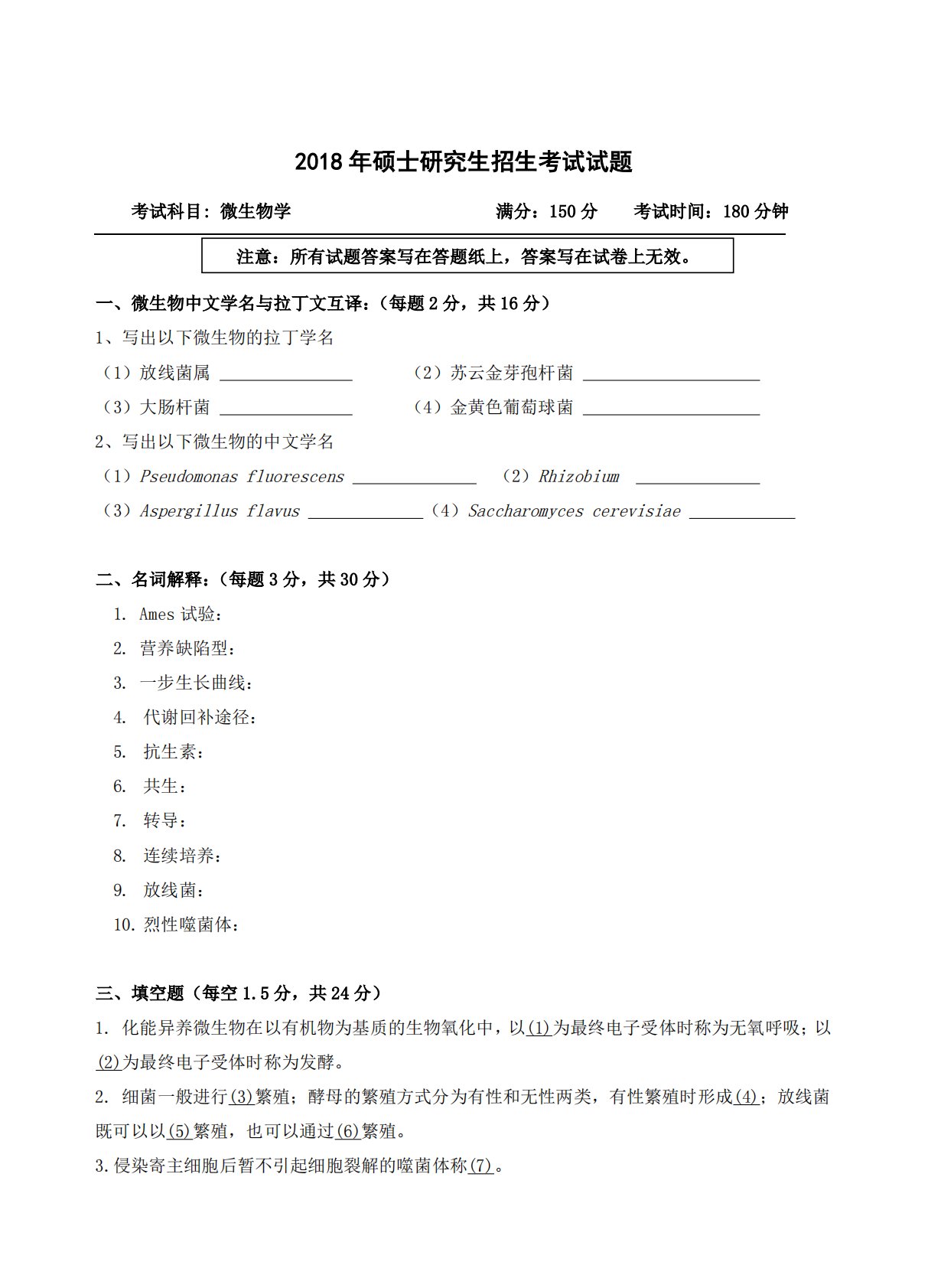 2018年硕士研究生招生考试试题考试科目:微生物学满分:150分考试时间:180分钟一、微生物中文学名与拉丁文互译:(每题2分,共16分)1、写出以下微生物的拉丁学名(1)放线菌属(2)苏云金芽孢杆菌(3)大肠杆菌(4)金黄色葡萄球菌2、写出以下微生物的中文学名(1)Pseudomonasfluorescens(2)Rhizobium(3)Aspergillusflavus(4)Saccharomycescerevisiae枯草二、名词解释:(每题3分,共30分)1.Ames试验:2.营养缺陷型:3.一步生长曲线:4.代谢回补途径:5.抗生素:6.共生:7.转导:8.连续培养:9.放线菌:10...