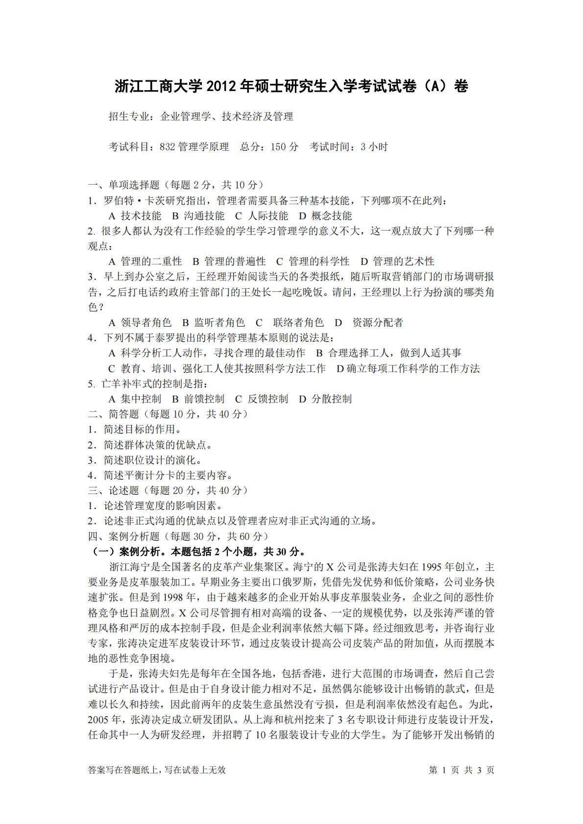 答案写在答题纸上,写在试卷上无效第1页共3页浙江工商大学2012年硕士研究生入学考试试卷(A)卷招生专业:企业管理学、技术经济及管理考试科目:832管理学原理总分:150分考试时间:3小时一、单项选择题(每题2分,共10分)1.罗伯特·卡茨研究指出,管理者需要具备三种基本技能,下列哪项不在此列:A技术技能B沟通技能C人际技能D概念技能2.很多人都认为没有工作经验的学生学习管理学的意义不大,这一观点放大了下列哪一种观点:A管理的二重性B管理的普遍性C管理的科学性D管理的艺术性3.早上到办公室之后,王经理开始阅读当天的各类报纸,随后听取营销部门的市场调研报告,之后打电话约政府主管部门的王处长一起吃...