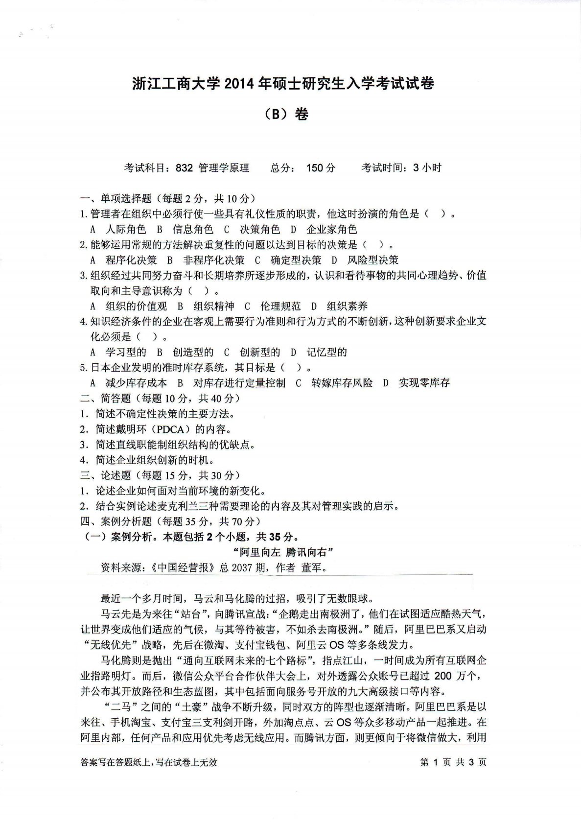 浙江工商大学832管理学原理2014年真题