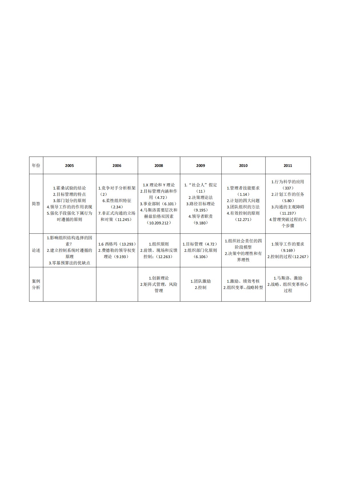 年份200520062008200920102011简答1.霍桑试验的结论2.目标管理的特点3.部门划分的原则4.领导工作的的作用表现5.强化手段强化下属行为时遵循的原则1.竞争对手分析框架(2)6.柔性组织特征(2.34)7.非正式沟通的立场和对策(11.245)1.X理论和Y理论2.目标管理内涵和作用(4.72)3.事业部制(6.101)4.马斯洛需要层次和赫兹伯格双因素(10.209.212)1.“社会人”假定(11)2.决策理论法3.路径目标理论(9.195)4.领导者职责(9.180)1.管理者技能要求(1.14)2.计划的四大问题3.团队组织的方法4.有效控制的原则(12.271)...