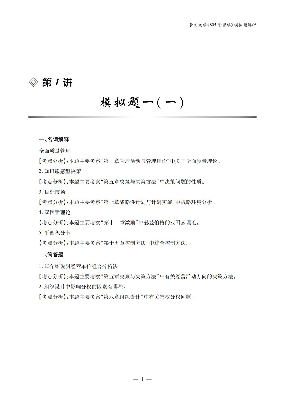 ?第1讲模拟题一(一)一、名词解释全面质量管理【考点分析】:本题主要考察“第一章管理活动与管理理论”中关于全面质量理论。2.知识敏感型决策【考点分析】:本题主要考察“第五章决策与决策方法”中决策问题的性质。3.目标市场【考点分析】:本题主要考察“第七章战略性计划与计划实施”中战略环境分析。4.双因素理论【考点分析】:本题主要考察“第十二章激励”中赫兹伯格的双因素理论。5.平衡积分卡【考点分析】:本题主要考察“第十五章控制方法”中综合控制方法。二、简答题1.试介绍说明经营单位组合分析法【考点分析】:本题主要考察“第五章决策与决策方法”中有关经营活动方向的决策方法。2.组织设计中影响分权的因素有哪...