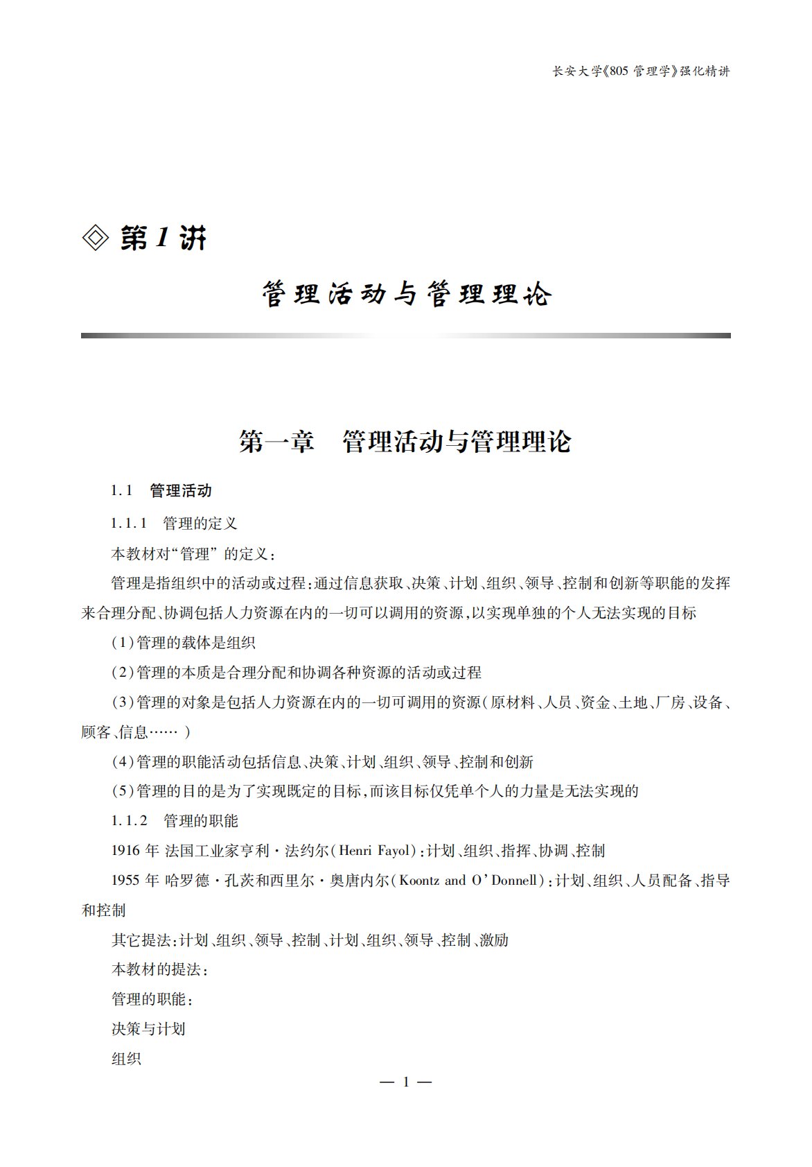 ?第1讲管理活动与管理理论第一章 管理活动与管理理论1.1 管理活动1.1.1 管理的定义本教材对“管理”的定义:管理是指组织中的活动或过程:通过信息获取、决策、计划、组织、领导、控制和创新等职能的发挥来合理分配、协调包括人力资源在内的一切可以调用的资源,以实现单独的个人无法实现的目标(1)管理的载体是组织(2)管理的本质是合理分配和协调各种资源的活动或过程(3)管理的对象是包括人力资源在内的一切可调用的资源(原材料、人员、资金、土地、厂房、设备、顾客、信息……)(4)管理的职能活动包括信息、决策、计划、组织、领导、控制和创新(5)管理的目的是为了实现既定的目标,而该目标仅凭单个人的力量是无法...