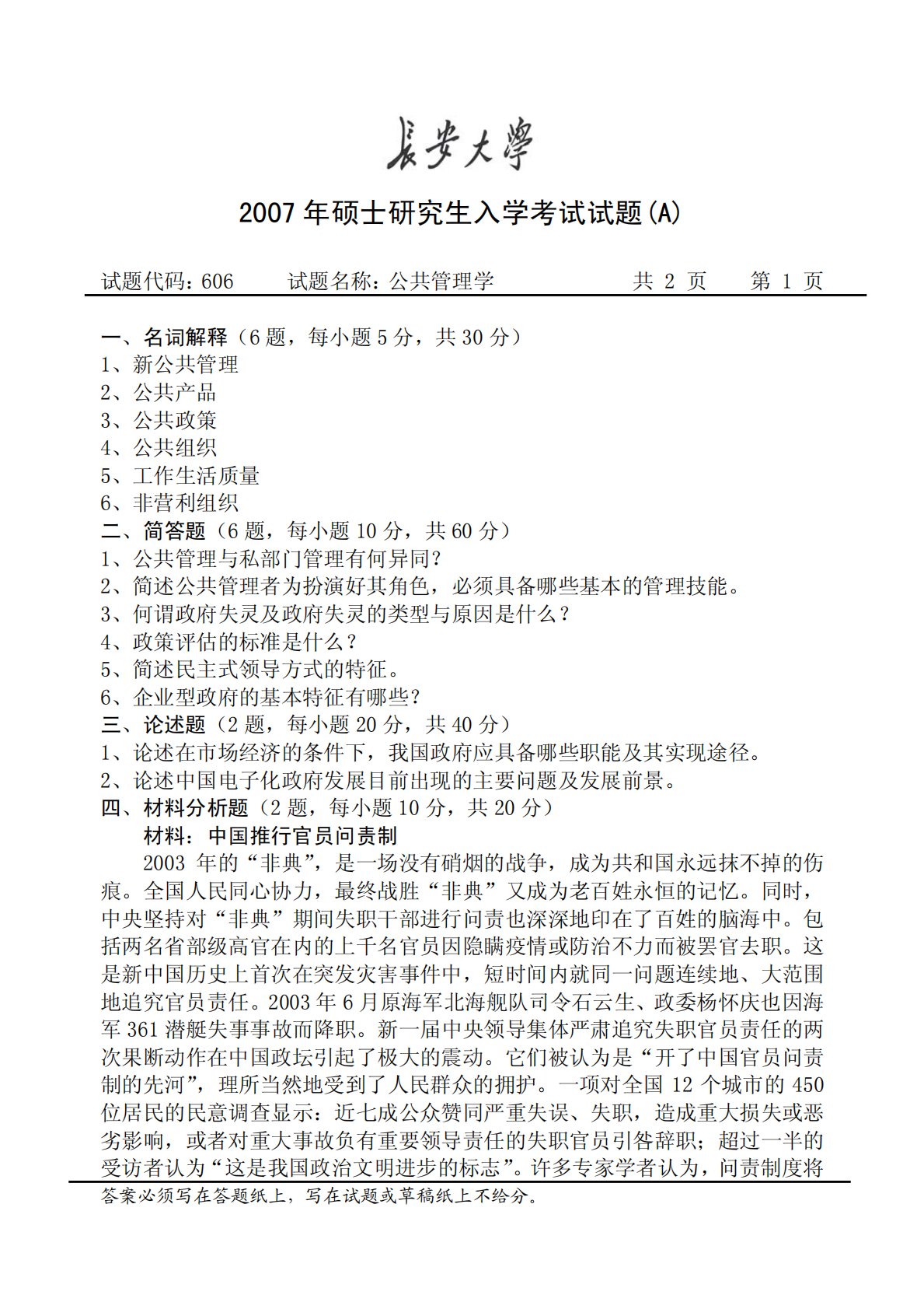 2007年硕士研究生入学考试试题(A)试题代码:606试题名称:公共管理学共2页第1页一、名词解释(6题,每小题5分,共30分)1、新公共管理2、公共产品3、公共政策4、公共组织5、工作生活质量6、非营利组织二、简答题(6题,每小题10分,共60分)1、公共管理与私部门管理有何异同?2、简述公共管理者为扮演好其角色,必须具备哪些基本的管理技能。3、何谓政府失灵及政府失灵的类型与原因是什么?4、政策评估的标准是什么?5、简述民主式领导方式的特征。6、企业型政府的基本特征有哪些?三、论述题(2题,每小题20分,共40分)1、论述在市场经济的条件下,我国政府应具备哪些职能及其实现途径。2、论述中国电...