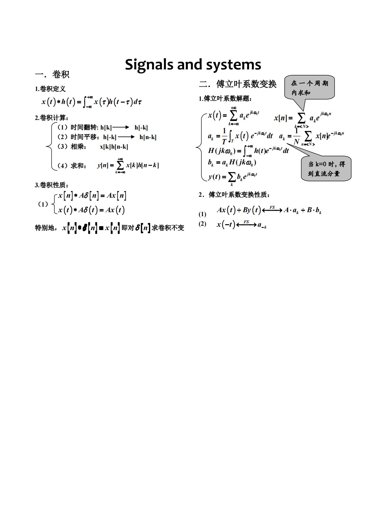 一.卷积1.卷积定义2.卷积计算:(1)时间翻转:h[k]h[-k](2)时间平移:h[-k]h[n-k](3)相乘:x[k]h[n-k](4)求和:3.卷积性质:(1)特别地,xnnxn即对n求卷积不变二.傅立叶系数变换1.傅立叶系数解题:2.傅立叶系数变换性质:(1)(2)xthtxhtdynxkhnkk[][][]xtAtAxtxnAnAxnHjkhtedtjkt()()00baHjkkk()0ytbekkjkt()0xtaekkjkt...
